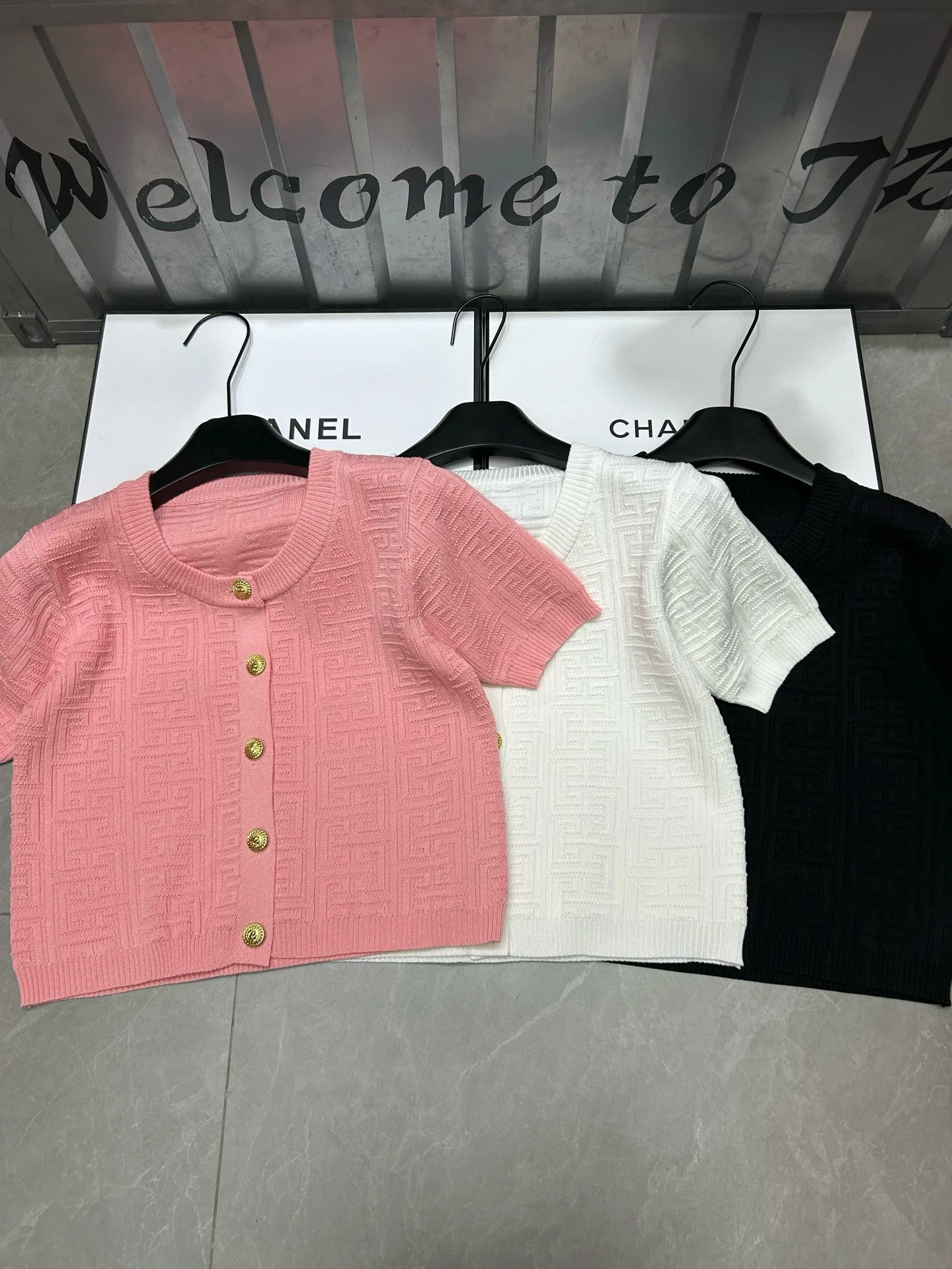 Luxus Balmain Kurzarm Gold Strick Monogramm Luxus
