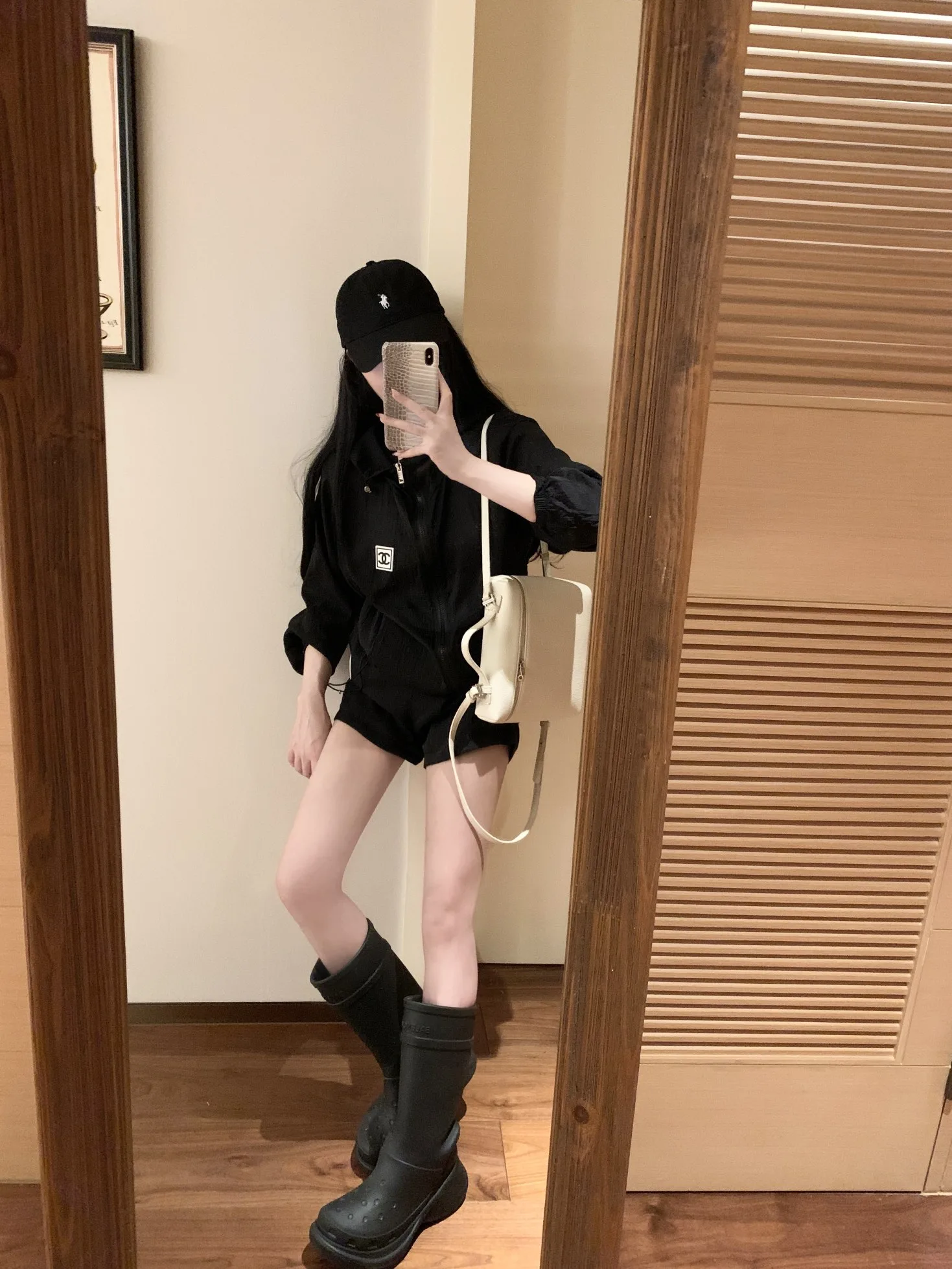 CHANEL* Gebrauchtes Set aus Tencel Sonnenschutz-Kapuzenjacke und Shorts aus Leather Label. Gefütterte Shorts. Farbe: Schwarz