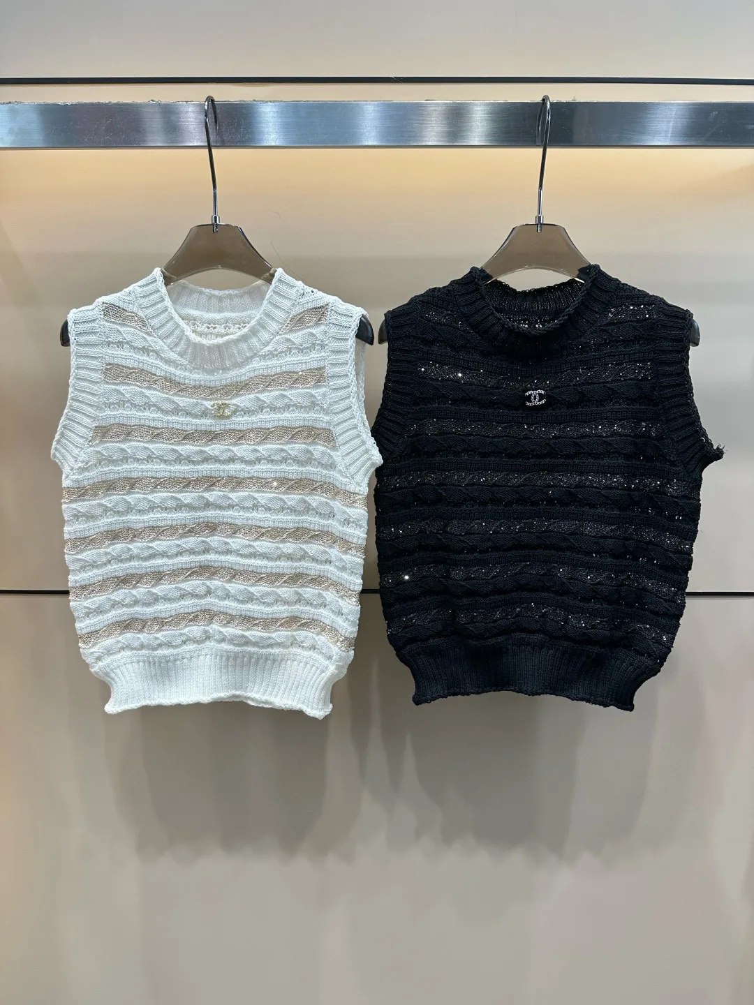 Luxus Chanel Weste Weiß Strick Gestreift Luxus
