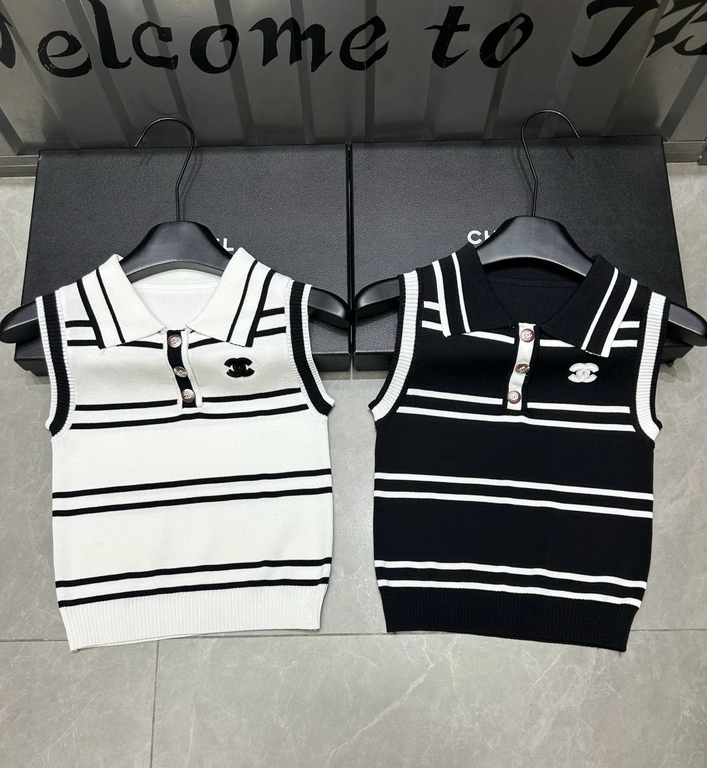 Luxus Chanel Weste Weiß Strick Gestreift Stil