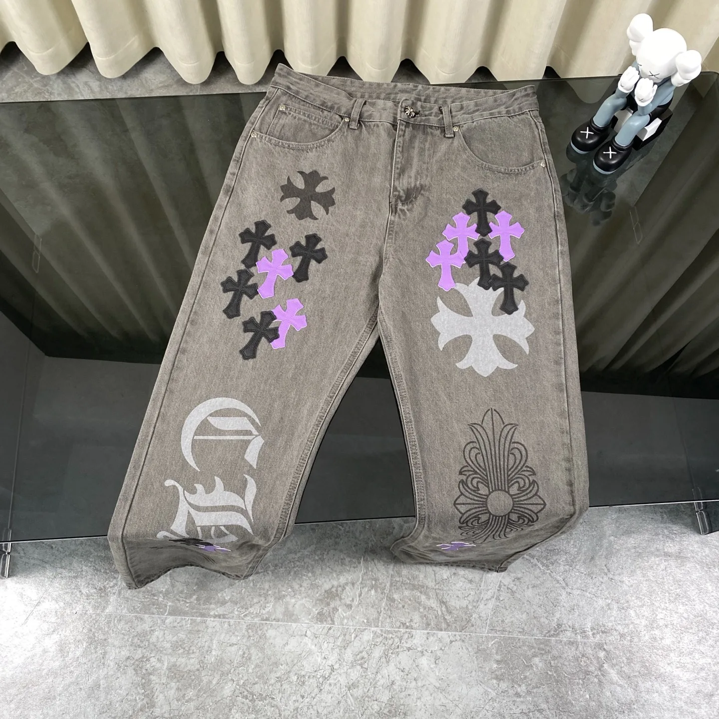 Chrome Hearts SS – Offizielle limitierte Edition – Lila Kuh-Graffiti-Lederjeans mit Einsätzen!