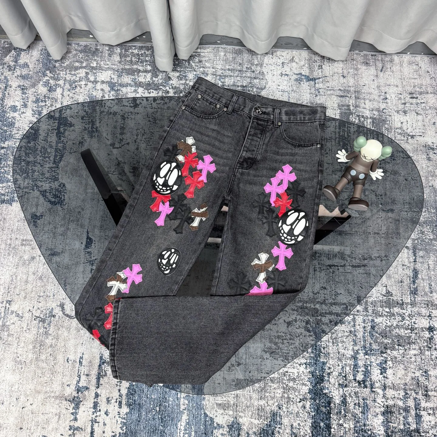 Dreifarbiges Leder-Patchwork von Chrome Hearts CH mit Ghostface-Details – die gleiche Kreuzstich-Jeans wie bei Rapper Nomi.