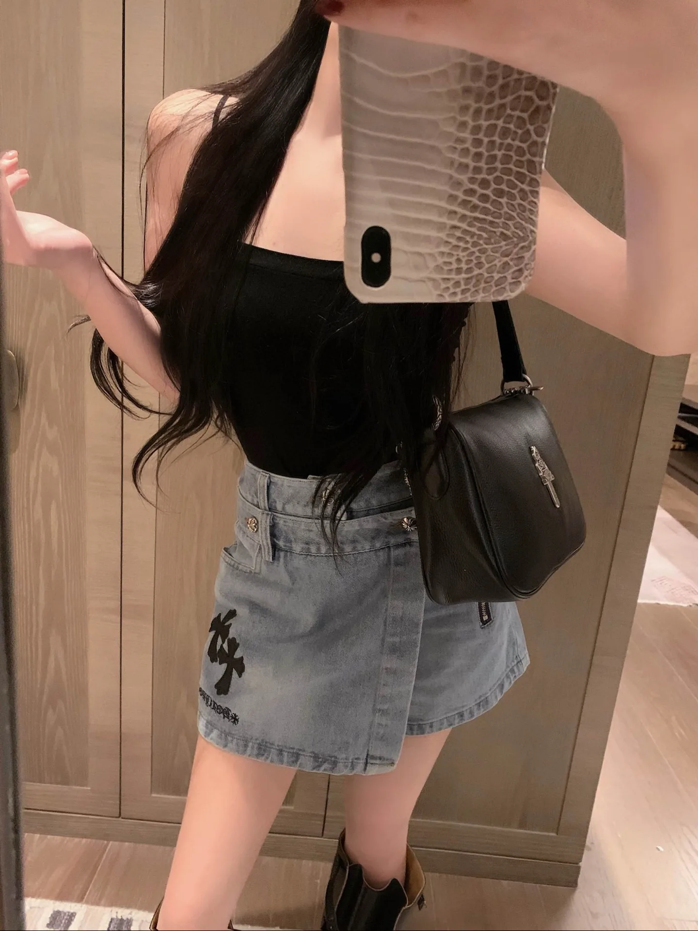 Chrome Hearts CH Cross Lederlabel mit Sanskrit-Stickerei, individuellem Reißverschluss und individuellen Knöpfen, gewaschene Jeansshorts und -rock