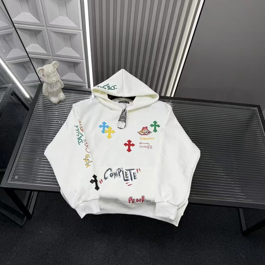 Empfohlenes Sweatshirt für den Frühherbst: Chrome Hearts Leder-Kapuzensweatshirt mit Kreuz-Applikation und Stickerei sowie Graffiti-Print. Alle drei Labels sind identisch mit denen auf der offiziellen Website. Zoomen Sie hinein, um Details zu sehen. Foto mit der Originalkamera aufgenommen.
