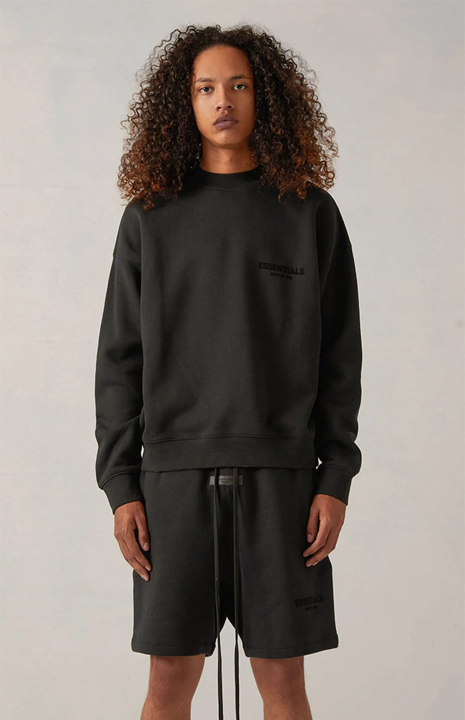 Fear Of God Essentials Crewneck Sweatshirt mit schwarzem Flock-Logo und Fleecefutter. American-High-Street-Style, Oversize, überschnittene Schultern, lockere Passform.