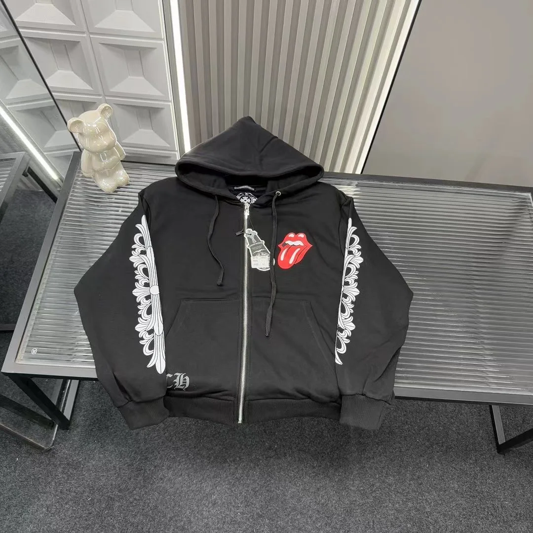 Empfohlenes Sweatshirt für den Frühherbst: Chrome Hearts Sanskrit-Kreuz-Logo mit personalisierter Kapuzenjacke mit weitem Halsausschnitt. Alle drei Logos sind identisch mit denen auf der offiziellen Website. Zoomen Sie hinein, um Details zu sehen. Foto mit der Originalkamera aufgenommen.