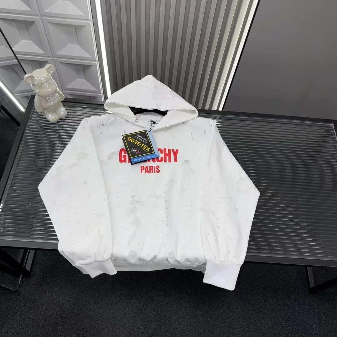 Empfohlenes Sweatshirt für den Frühherbst: Givenchys zerrissenes Kapuzensweatshirt mit unkenntlichem Finish. Alle drei Etiketten sind enthalten, passend zur offiziellen Website. Zoomen Sie hinein, um Details zu sehen. Foto mit der Originalkamera aufgenommen.