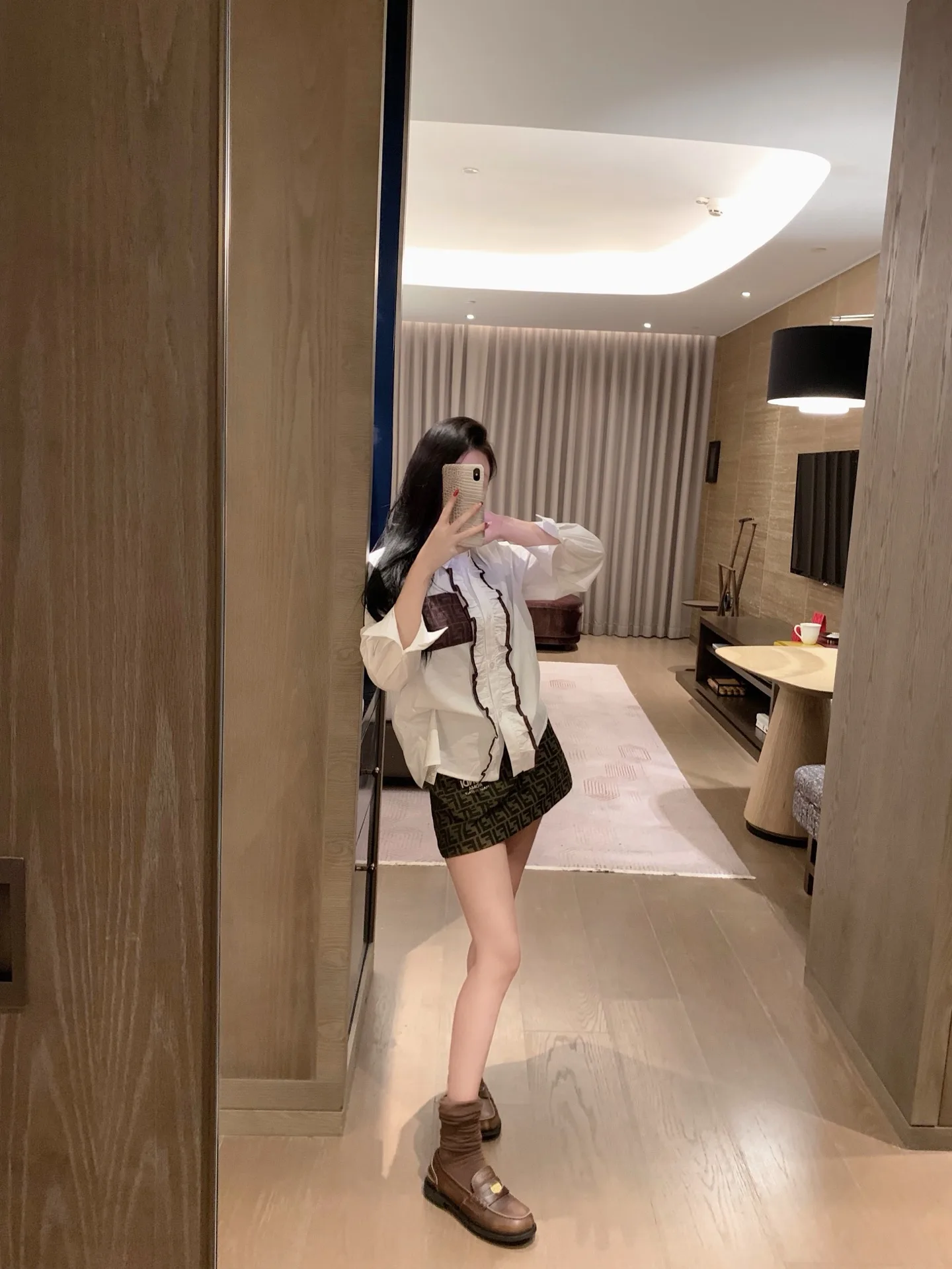 FEND* Fendi Rüschenbluse ohne Ohrringe – perfekt zum Jacquard-Minirock.