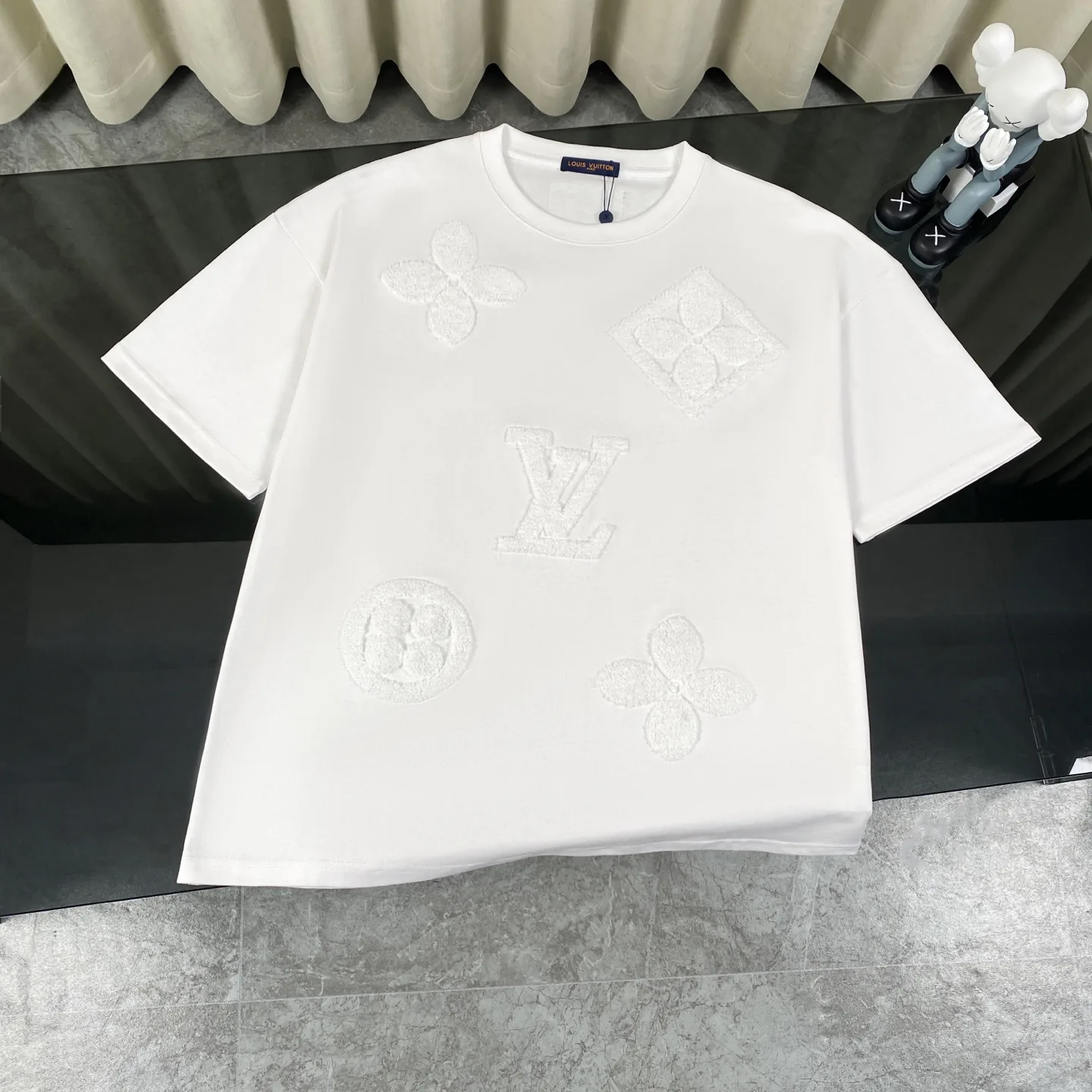 Louis Vuittons charakteristisches, kurzärmeliges Strick-T-Shirt mit Sonnenblumenstickerei.