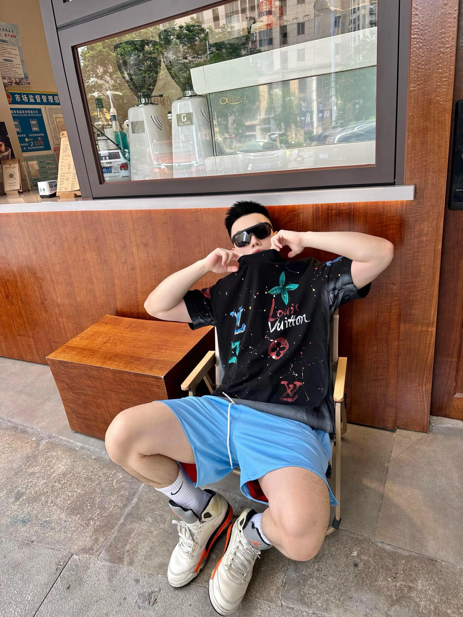 LOUIS VUITTON/LV – Neues, strapazierfähiges, kurzärmeliges T-Shirt mit Rundhalsausschnitt und Graffiti-Print im Used-Look