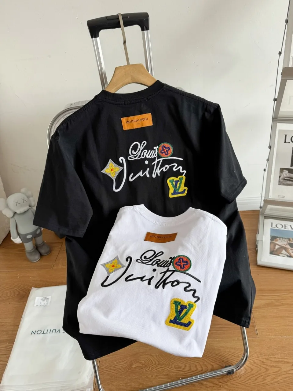 Für alle, die Sport und Freizeit gleichermaßen lieben, ist dieses T-Shirt perfekt für Ihren aktiven Lebensstil! Dieses Kurzarm-T-Shirt aus Baumwolle mit farbenfroher Blumenstickerei von Louis Vuitton ist aus reiner Baumwolle gefertigt und bietet hervorragende Atmungsaktivität. Schweiß verdunstet beim Training schnell und hält Sie trocken und komfortabel, ohne Ihre Leistung zu beeinträchtigen. Die zarte, farbenfrohe Blumenstickerei verleiht Ihrem sportlichen Look einen Hauch von Farbe und macht es zum Hingucker im Fitnessstudio oder auf dem Spielplatz. Das lockere Unisex-Design ermöglicht uneingeschränkte Bewegungsfreiheit und eignet sich perfekt zum Laufen, Yoga und Basketballspielen. Tragen Sie es zu Trainingsshorts für einen jugendlichen und energiegeladenen Look oder kombinieren Sie es mit einer Freizeithose für einen lässigen Look beim Abhängen mit Freunden. Ein T-Shirt, das alle Anforderungen erfüllt. Greifen Sie jetzt zu und genießen Sie die perfekte Balance aus Sport und Mode! Es wird mit Logo-Papier und der Originalverpackung geliefert! Sehr empfehlenswert!