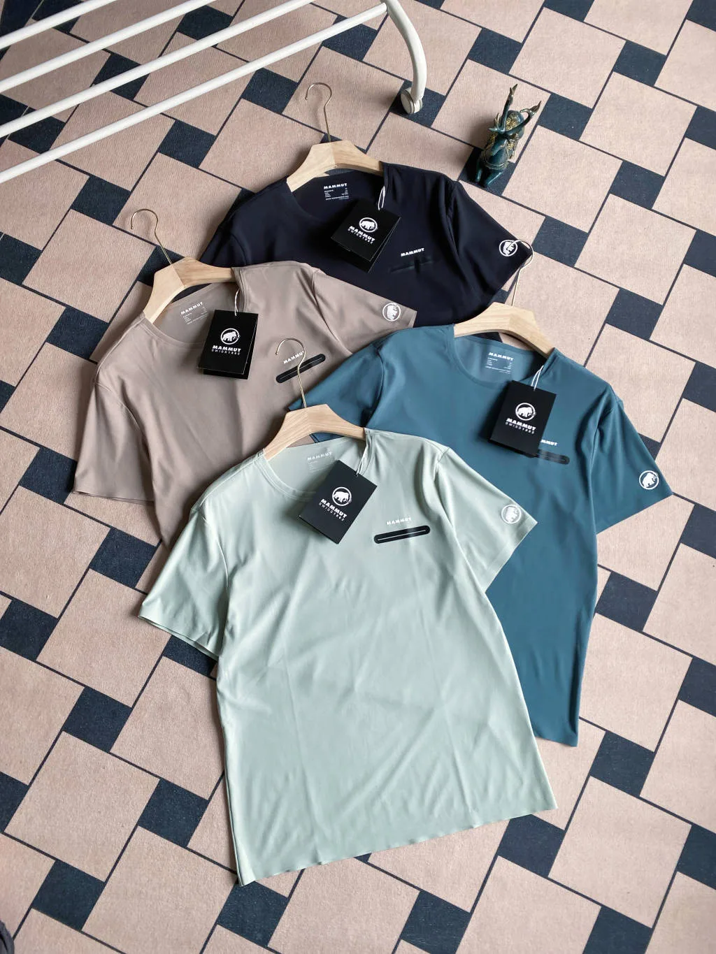 MAMMUTs neues, atmungsaktives, bedrucktes Kurzarm-T-Shirt aus laminierter Eisseide besteht aus Nylon-Eisseide. Diese hochwertige Piqué-Eisseide trocknet schnell, verblasst nicht, läuft nicht ein und fühlt sich ultraweich an – perfekt für den Sommer. Sie ist weich und geschmeidig und liegt angenehm auf der Haut. Das Eisseiden-Piqué-Netzgewebe ist innen und außen zirkuliert und rundum hochelastisch. Das sorgt für ein trockenes und atmungsaktives Tragegefühl bei sportlichen Aktivitäten ohne Einschnüren oder Beklemmungen.