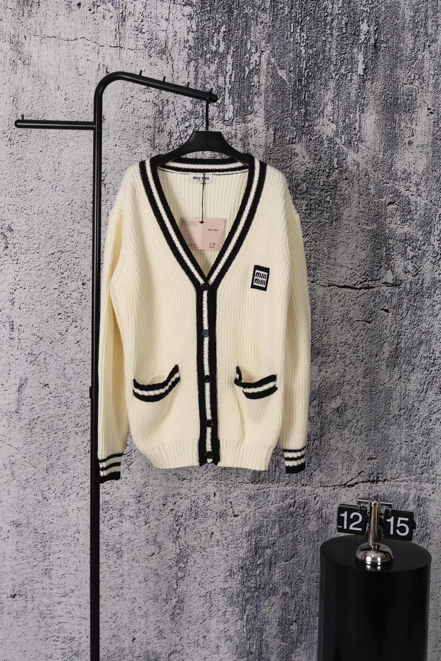 MiuMius kontrastierender Woll-Strickcardigan in Creme und Weiß. Dieser Cardigan wurde auf importierten Stoll-Flachstrickmaschinen gefertigt. Die Bündchen und das Band sind farbig, und die Kontrastnähte sorgen für einen auffälligen Effekt. Der Stoff besteht aus importiertem Kaschmir-Mischgarn, das dehnbar, pillingresistent und warm ist. Die Vorderseite verfügt über eine Tasche und ein klassisches Cardigan-Design mit V-Ausschnitt. Maßgefertigte matte Knöpfe. Miu Miu hat einen adretten Look! Er ist wirklich zeitlos und wird nie müde, ihn zu tragen. Der Look ist einfach umwerfend und fängt sowohl adrette als auch süße Looks perfekt ein. Größen: S, M, L