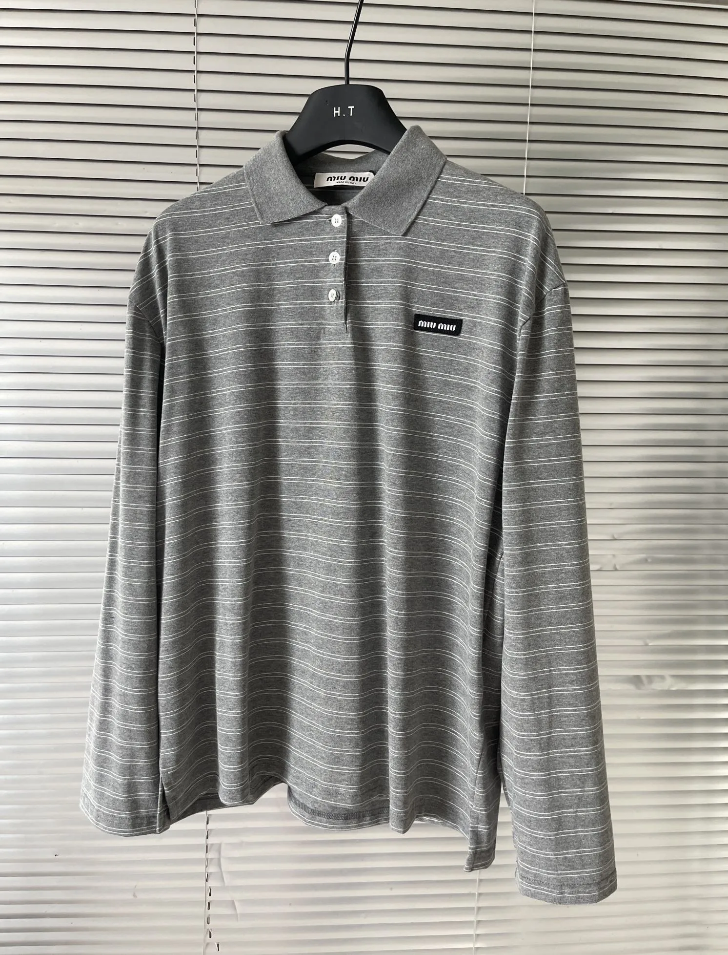 Hochwertiges MIU MIU SS Grau gestreiftes Langarm-Baumwoll-T-Shirt (Unisex)