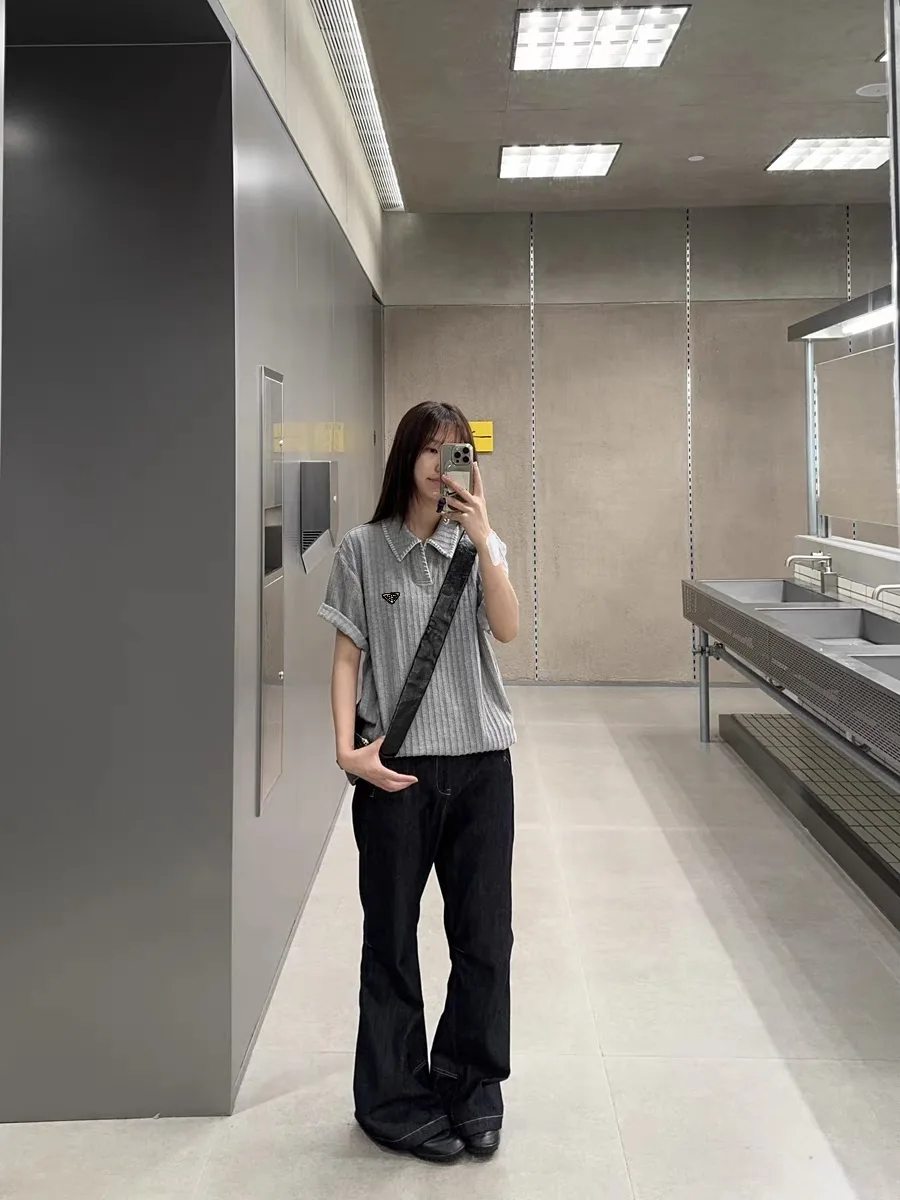 Pradas neues Sommer-Poloshirt ist empfehlenswert. Dieses individuell gewebte, zopfgestrickte Weizenährenmuster ist in Schwarz und Grau erhältlich. Der schlichte, elegante Stoff ist weich, griffig und knitterarm. Die lockere Silhouette mit überschnittenen Schultern ist bequem. Weiße, handgenähte Nähte am Ausschnitt sorgen für einen lässigen Touch. Das klassische Dreieck-Logo aus Metall auf der Brust verleiht einen Hauch von Klasse. Dieser stilvolle, altmodische Look ist schlicht und elegant. Dieses Poloshirt wird in Japan hergestellt und wird mit allen drei Etiketten und Anhängern geliefert. Sehr empfehlenswert.