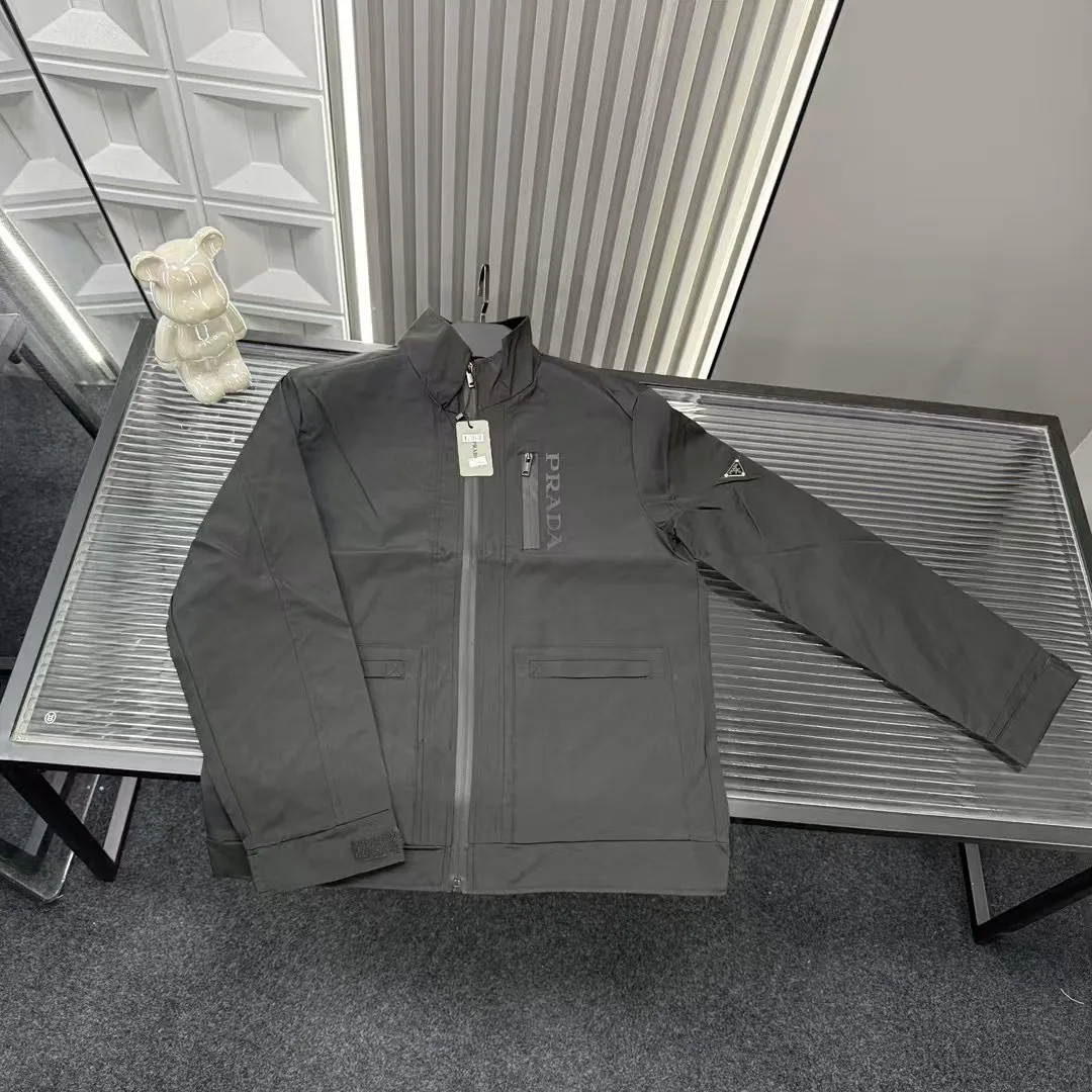Empfohlene Oberbekleidung für den Frühherbst: Pradas Jacke mit Stehkragen und dreieckigem Logo-Aufdruck, Schriftzug, Reißverschluss. Alle drei Logos sind identisch mit denen auf der offiziellen Website. Zoomen Sie hinein, um Details zu sehen. Foto mit der Originalkamera aufgenommen.