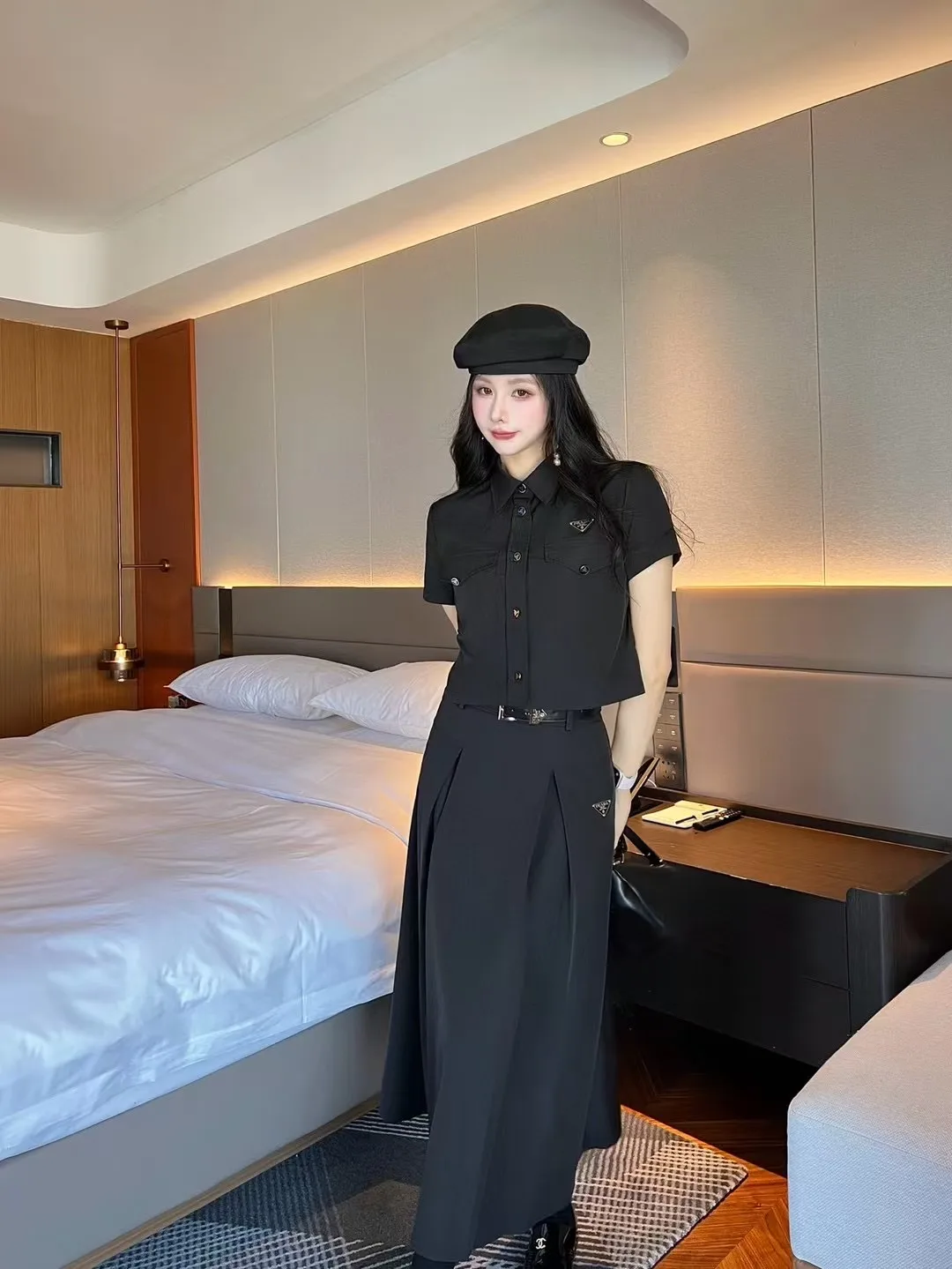 Prad*/Prada SS – Neues Set aus Top und Rock mit Revers / Klassisches Dreieckslogo verziert / Passender Gürtel / Zwei Farben, drei Größen
