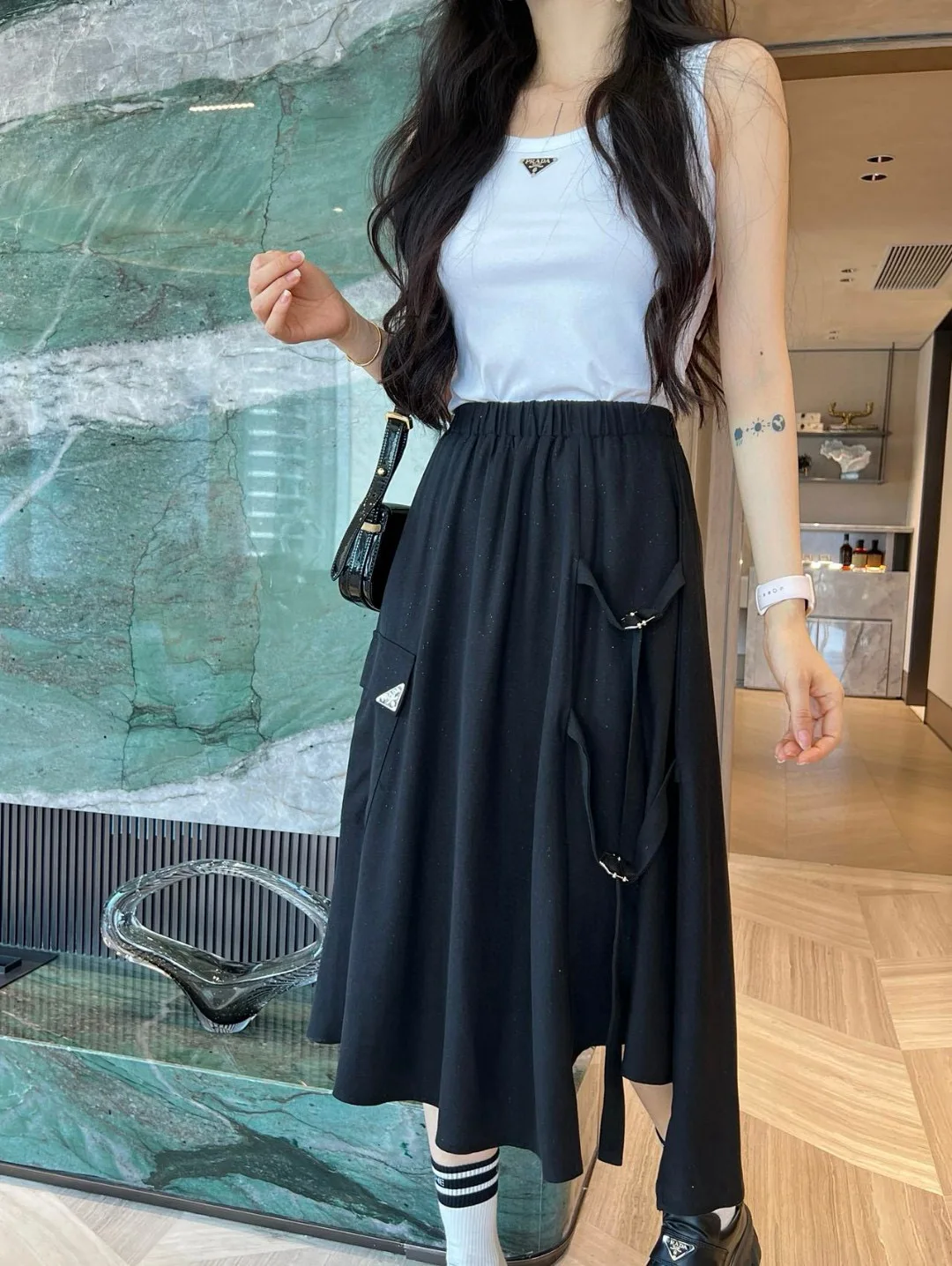 Prada-individuelles Dreieckslogo und seitliche Schnallen mit paillettenbesetztem, elastischem Taillenrock.