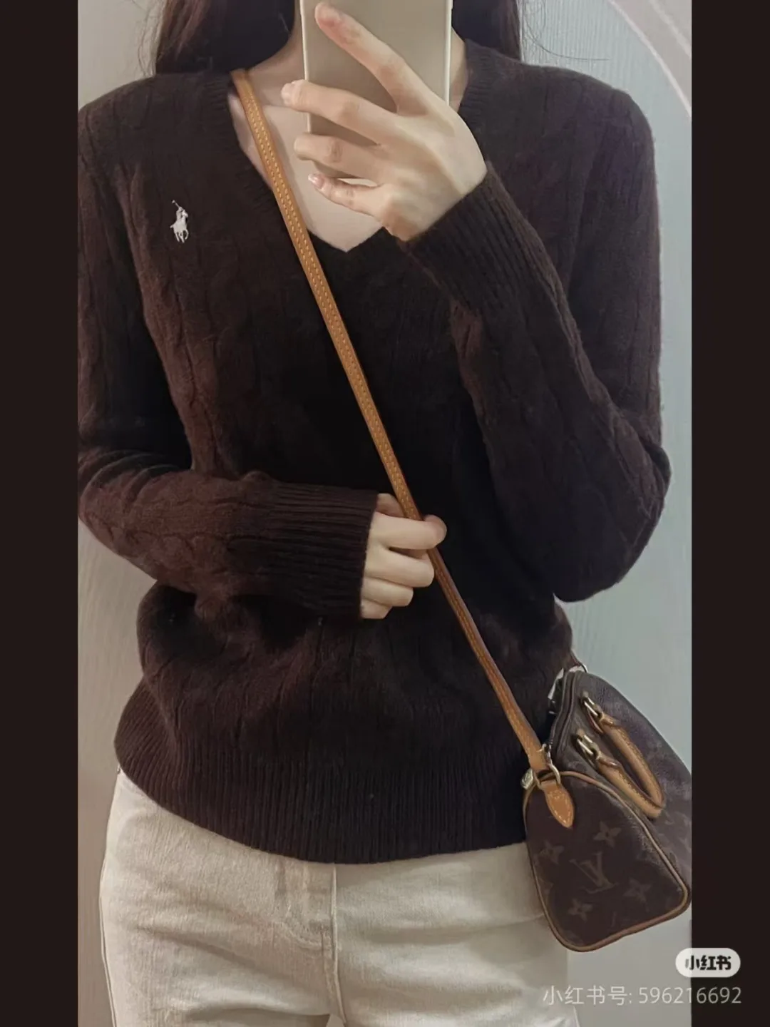 Ralph Lauren V-Ausschnitt, einfarbig, Pony-Logo, Hanfblüten-Strickpullover