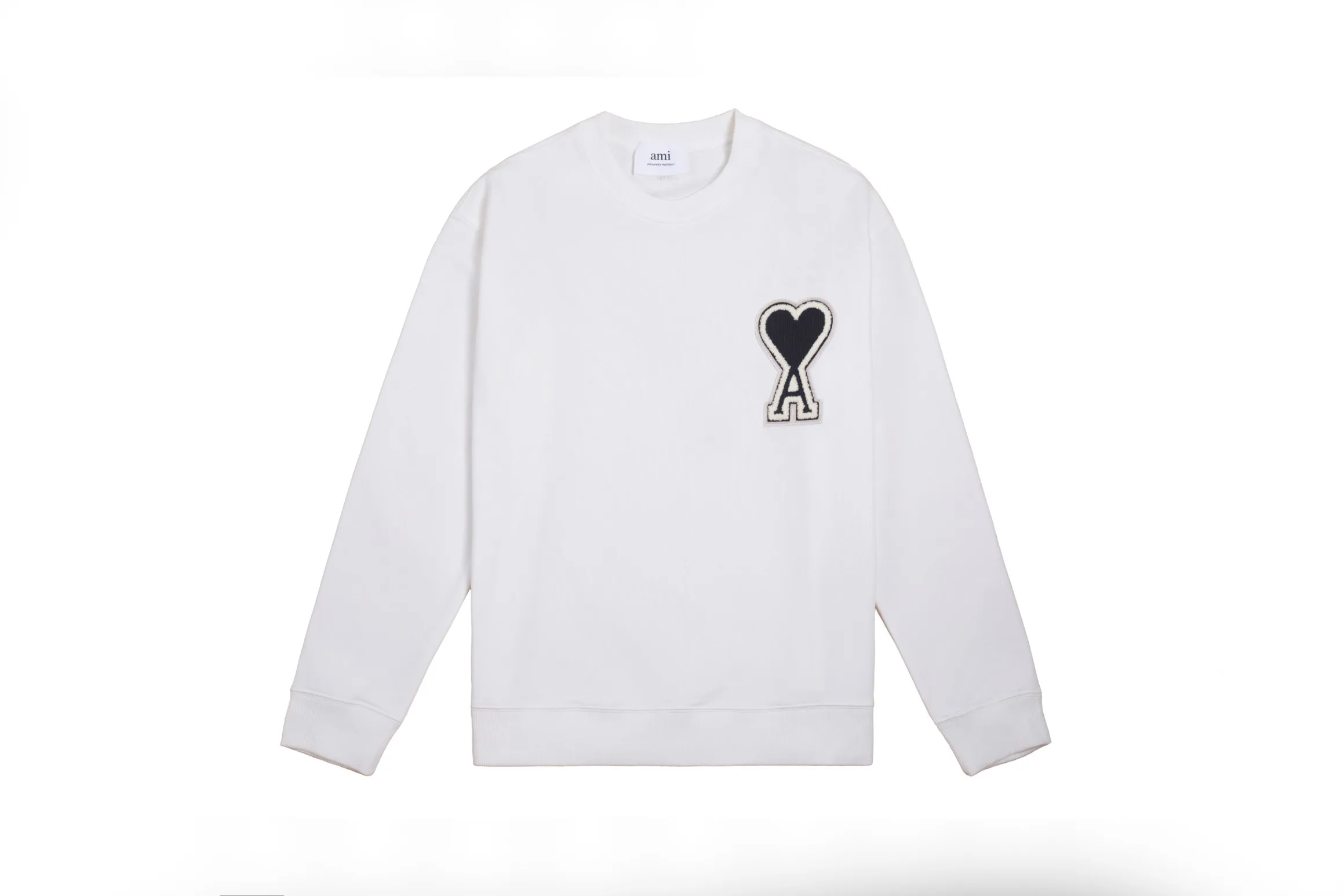 AMIs neuer Herbst-/Winter-Klassiker mit herzförmigem Herz-Emblem und Rundhals-Pullover. Maßgefertigt aus reiner Baumwolle. Hochwertiger, neuer Hauptstoff, gewaschen. Unisex-Stil. Farben: Weiß mit schwarzem Herz. Größen: S–XL.