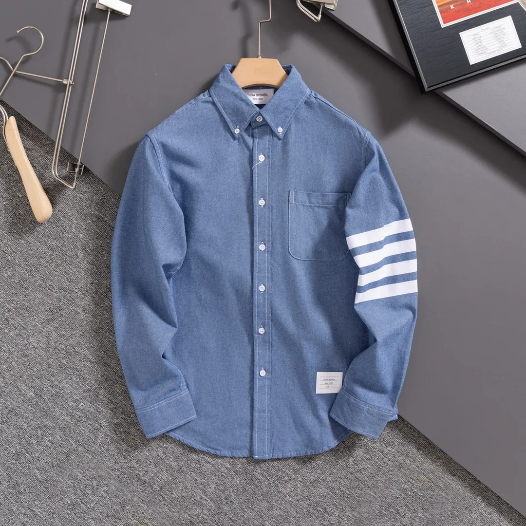 Thom Brownes neue TB-Jeansblau-Unisex-Jacke, Unisex-Hemd mit vier Streifen und Freizeithemd für Paare.
