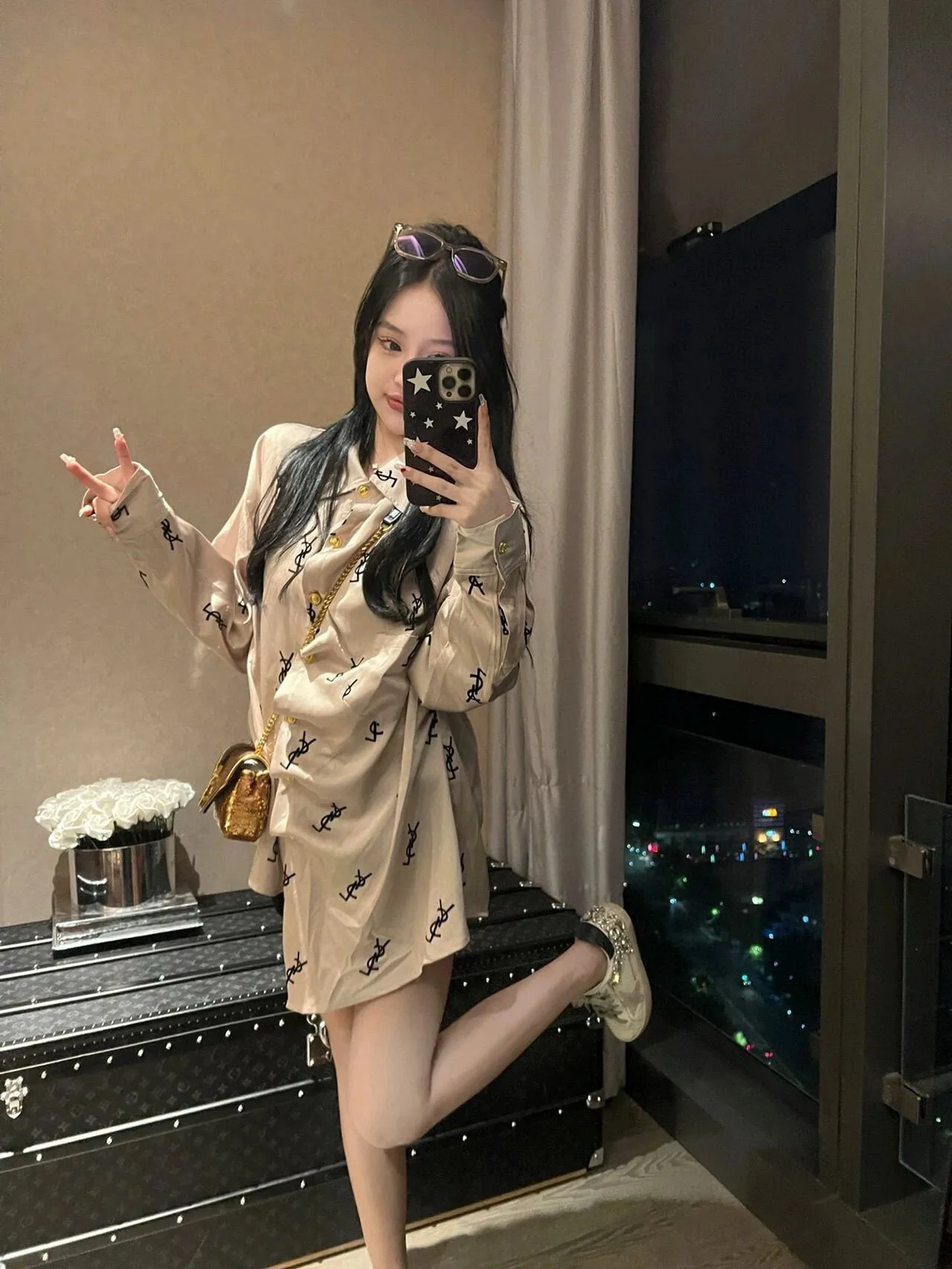 Yves Saint Laurent Hemd aus Acetat-Satin mit beflocktem Monogramm-Allover-Print und Goldknöpfen.