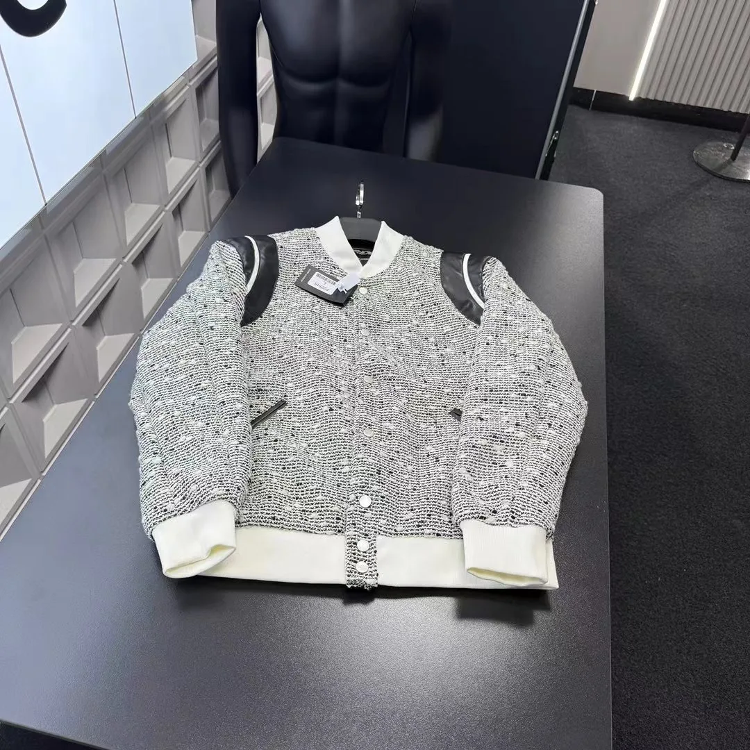 Empfohlener neuer Mantel: Saint Laurents Patchwork-Baseballjacke mit Stehkragen. Alle drei Etiketten sind enthalten und entsprechen der offiziellen Website. Zoomen Sie hinein, um Details zu sehen. Foto mit der Originalkamera aufgenommen.