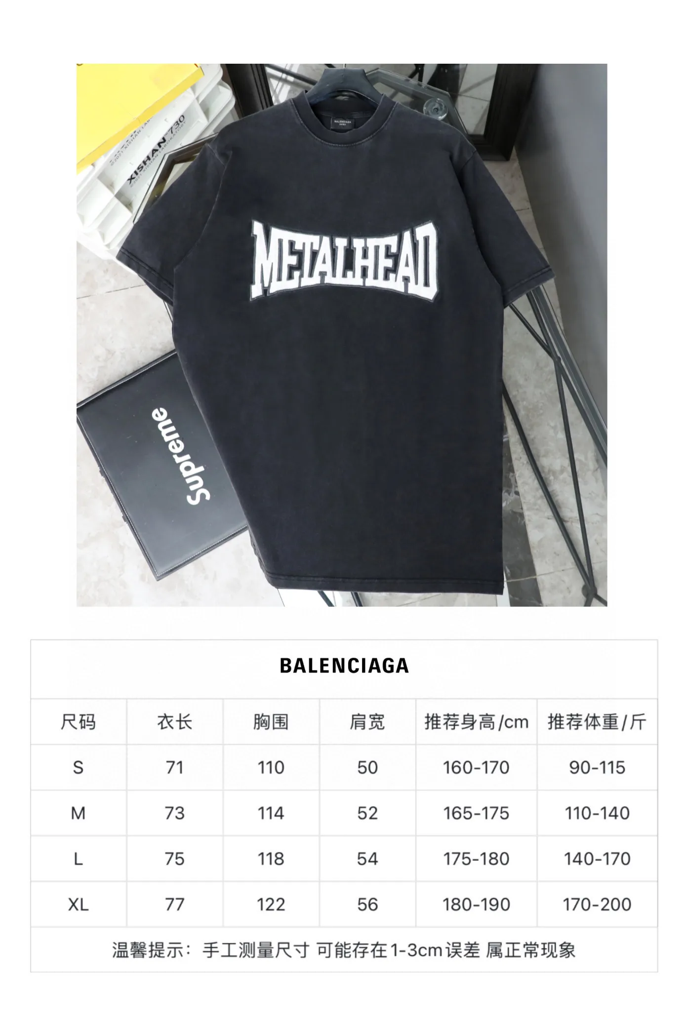 Detailansicht des neuen, gewaschenen, kurzärmeligen T-Shirts mit Rundhalsausschnitt und Logo-Applikation von Balenciaga.