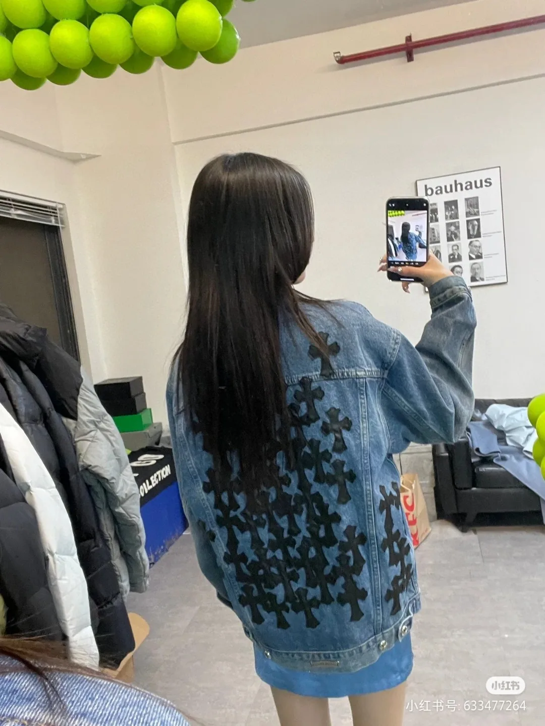 Chrome Heart Limited Edition CH Cross-Printed Leather Label Washed Denim Jacke