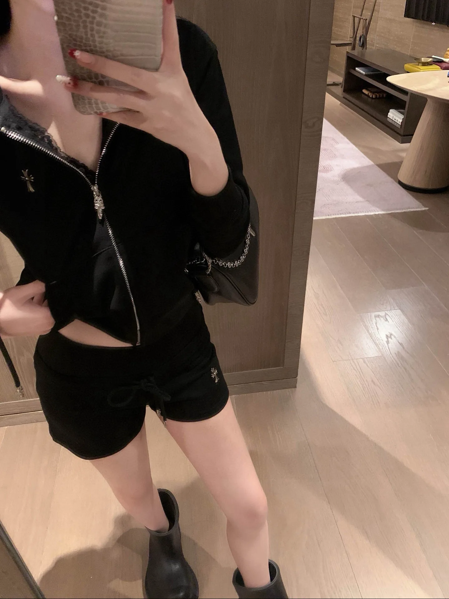 Chrome Hearts CH Cross Leder-Logo-Set mit Kapuzenjacke und Kordelzug-Shorts