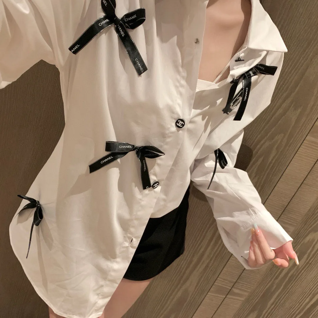 Chanel-Bluse mit individuell besticktem Vintage-Doppel-C-Lederpatch, individuellen Knöpfen und handgefertigter Schleife.