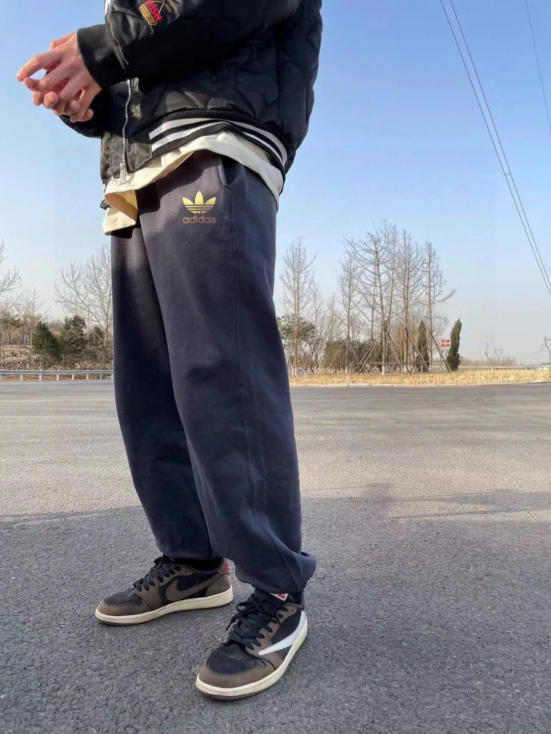 Neue, fleecegefütterte Adidas Trefoil Jogginghose in Premium-Grau mit Gold-Label-Print.