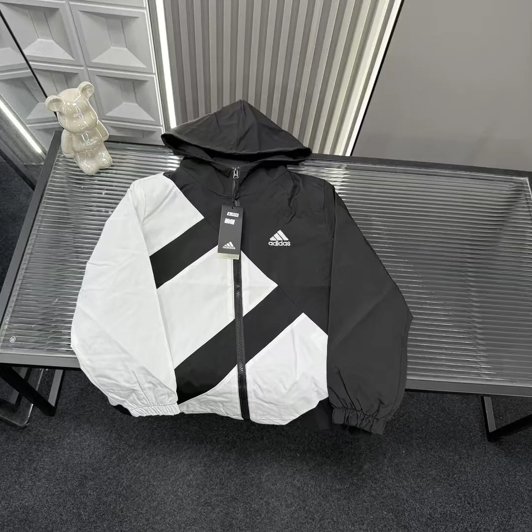 Empfohlene Oberbekleidung für den Frühherbst: Diese Adidas-Kapuzenjacke mit vollflächig bedrucktem, halbgesticktem und kleinem Logo. Alle drei Logos sind identisch mit denen auf der offiziellen Website. Zoomen Sie hinein, um Details zu sehen. Foto mit der Originalkamera aufgenommen.