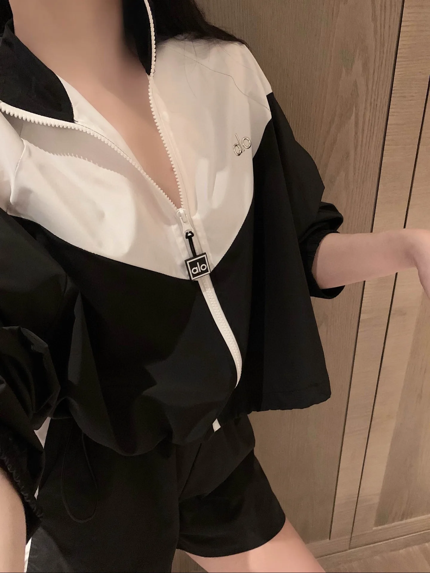 Alo Monochrome Print Schwarz-Weiß Reißverschlussjacke mit elastischer Taillenshorts Sonnenschutz-Set