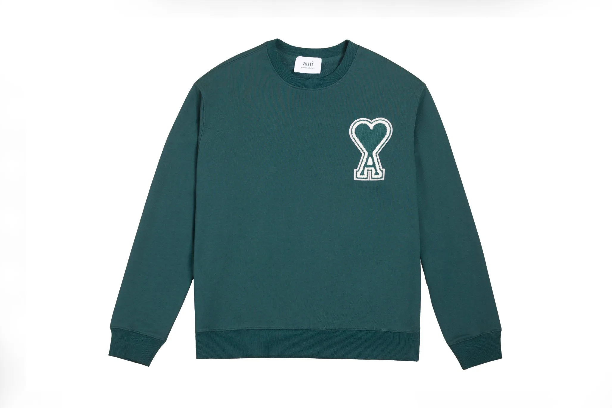 AMIs neuer Herbst-/Winterklassiker mit herzförmigem Emblem und Rundhals-Pullover. Maßgefertigt aus reiner Baumwolle. Hochwertiger, neuer Hauptstoff, gewaschen. Unisex-Stil. Farbe: Dunkelgrün. Größen: S–XL.