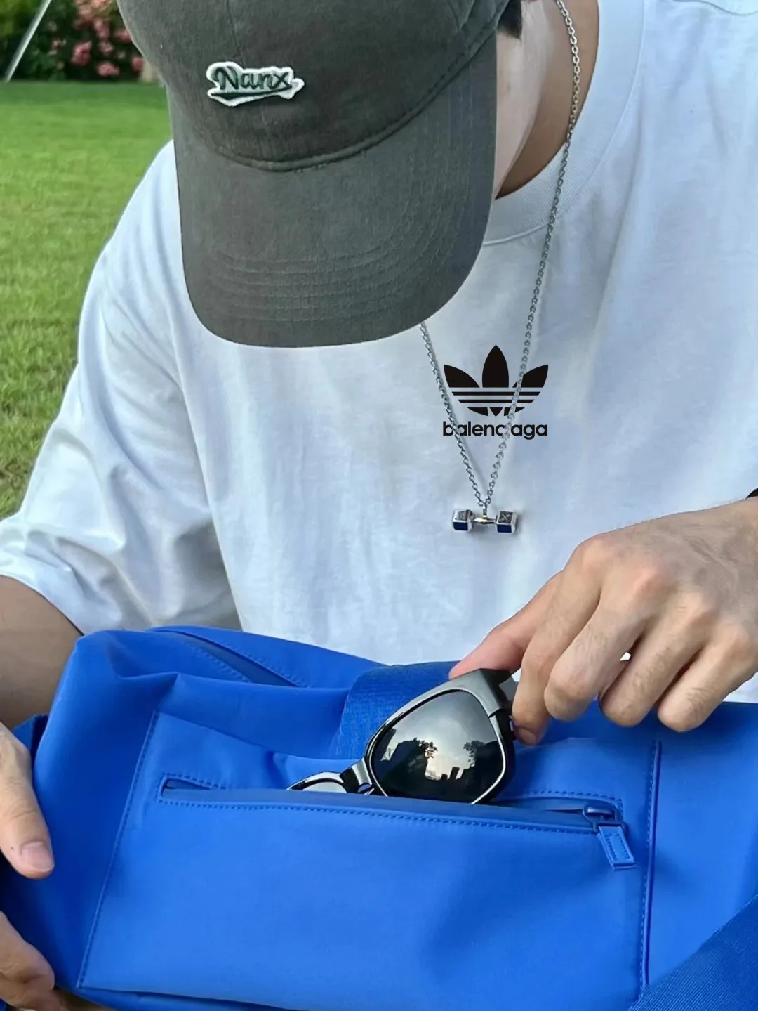 Balenciaga & Adidas & Balenciaga Kollaboration: Ein dreifarbiges Kurzarmhemd mit zentralem Dreiblatt-Print.