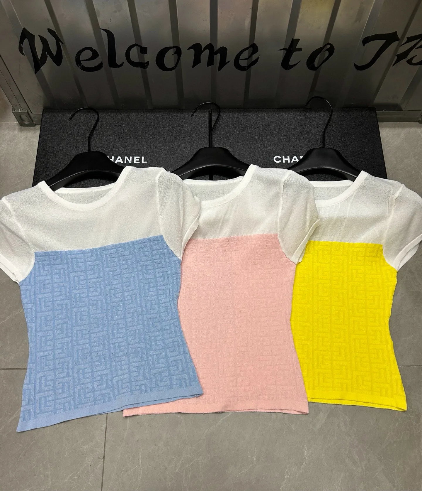 Premium Balmain Kurzarm Blau Strick Monogramm Kollektion