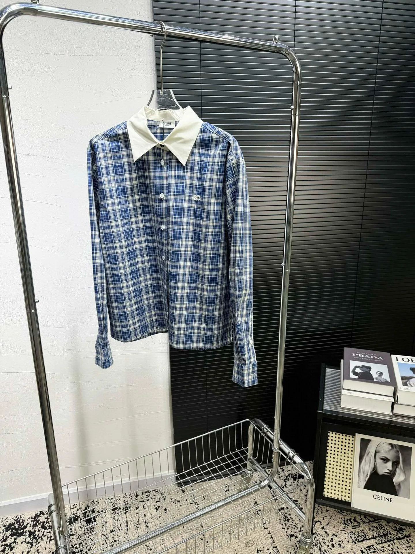 Celine Arc de Triomphe Hemd mit besticktem Revers und kleinem Karomuster in Blau