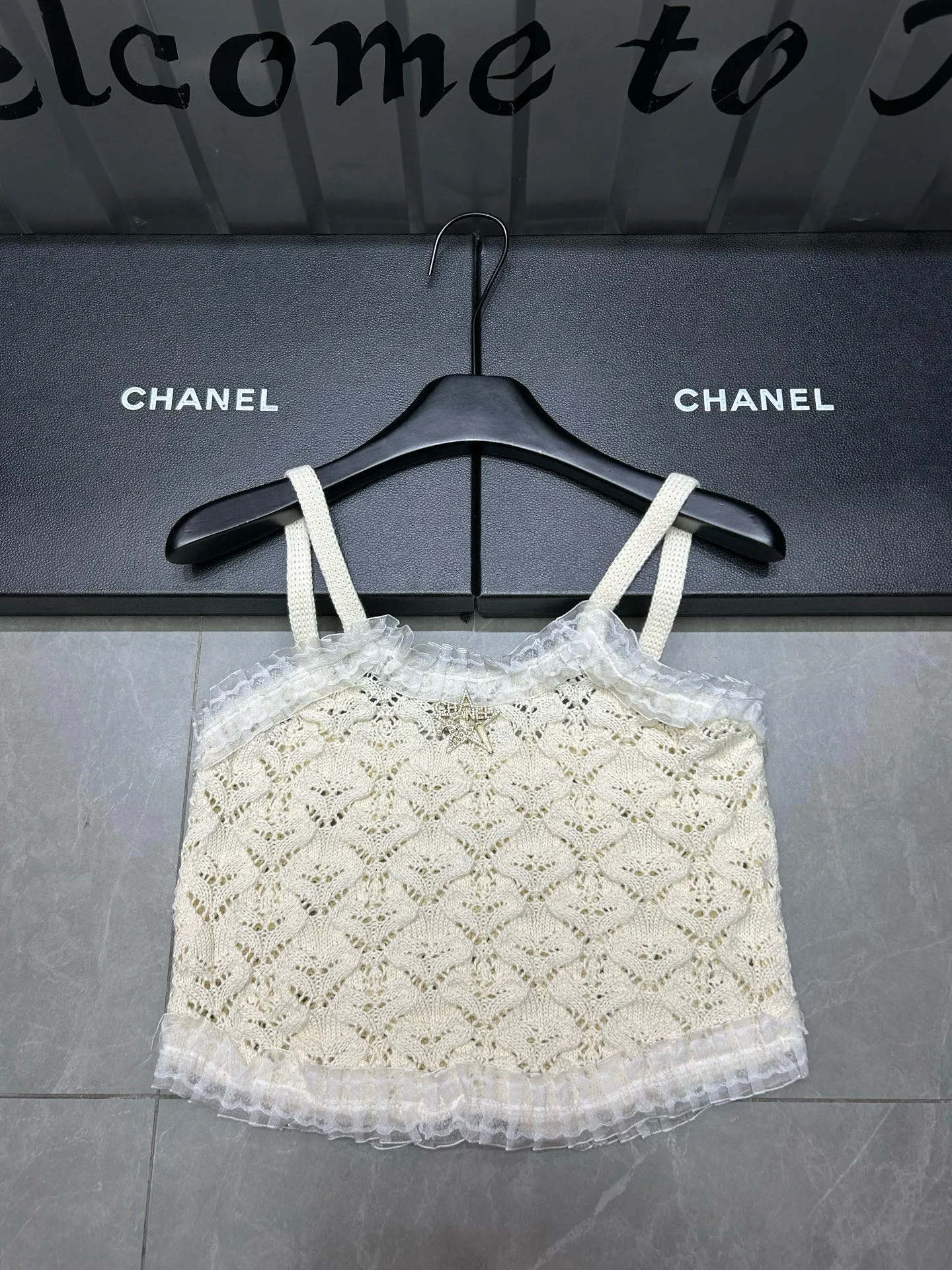 Chanel Spitzenbesatz-Top mit Lochmuster und Brosche