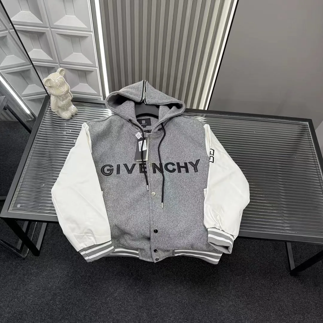 Neue Oberbekleidungsempfehlung: Givenchys Patchwork-Kapuzenjacke aus Leder mit Ärmeln. Sie verfügt über ein gesticktes Uhrenlogo und einen Brustaufnäher mit gestickten Buchstaben. Alle drei Logos sind identisch mit denen auf der offiziellen Website. Zoomen Sie hinein, um Details zu sehen. Foto aufgenommen mit der Originalkamera.