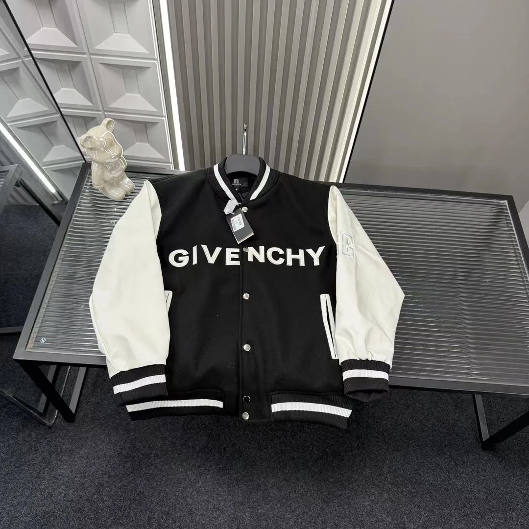 Empfohlene neue Jacken: Givenchys Patchwork-Jacke mit Lederärmeln und Stehkragen. Sie verfügt über ein gesticktes Uhrenlogo und einen Brustaufnäher mit gestickten Buchstaben. Alle drei Logos sind identisch mit denen auf der offiziellen Website. Zoomen Sie hinein, um Details zu sehen. Foto mit der Originalkamera aufgenommen.