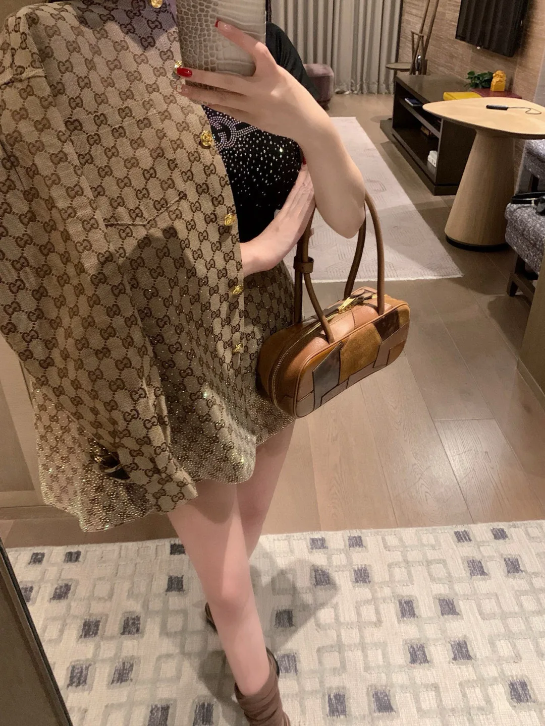 Maßgefertigtes Gucci-Monogramm mit Doppel-G-Goldknöpfen und Jacquard-Muster, Revers und Saum mit Strasssteinen.
