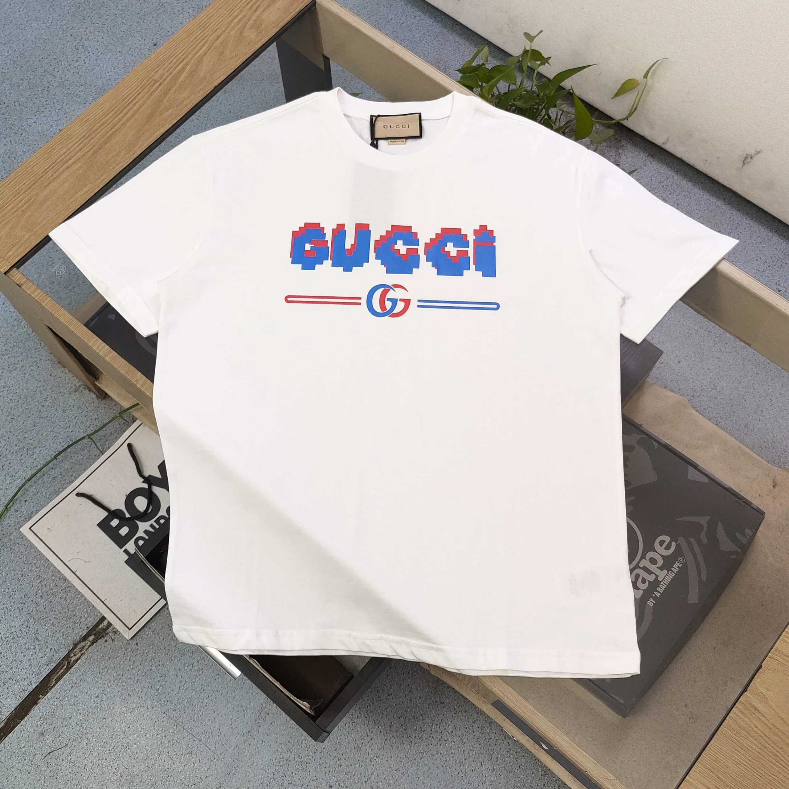 Neues, lässiges, kurzärmeliges GUCCI T-Shirt mit gepixeltem Doppel-G-Logo-Print für Paare. Einzigartig gefärbt aus umweltfreundlicher, doppelt gekämmter Baumwolle für ein geschmeidiges, pillingresistentes Tragegefühl. Hergestellt aus hochwertiger, doppelt gekämmter, glatter Baumwolle. Garantierte Qualität. Maßgefertigter Stoff, individuell gefärbt und mit Patina bedruckt für ein umweltfreundliches, rissfestes Finish. Qualität vergleichen. Unisex-Style!