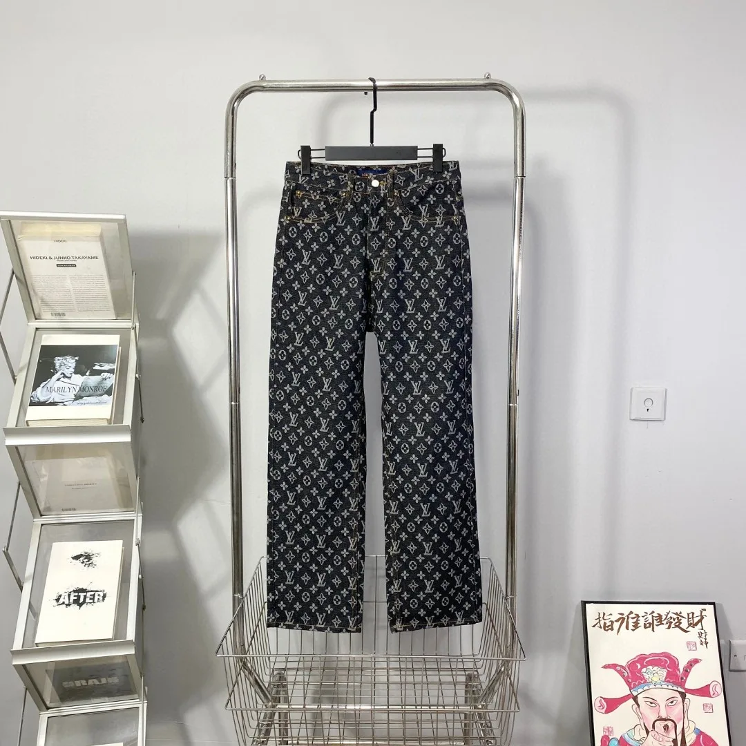 Jeans mit Allover-Print im Co-Branding von LOUIS VUITTON. Hochwertiger, individueller Stoff: Detailreicher, dreidimensionaler Schriftzug, maßgeschneidertes Futter, Schnalle aus Kalbsleder, exklusive Perlmuttknöpfe aus Metall, Laserschriftzug und ein authentisches, importiertes Tajima-Stickmuster. Die intensive Handwäsche sorgt für ein zartes, atmungsaktives und angenehmes Tragegefühl, vergleichbar mit handelsüblichen ZP-Jeans. Perfekt für Damen und Herren – diese Unisex-Jeans ist die beste auf dem Markt!