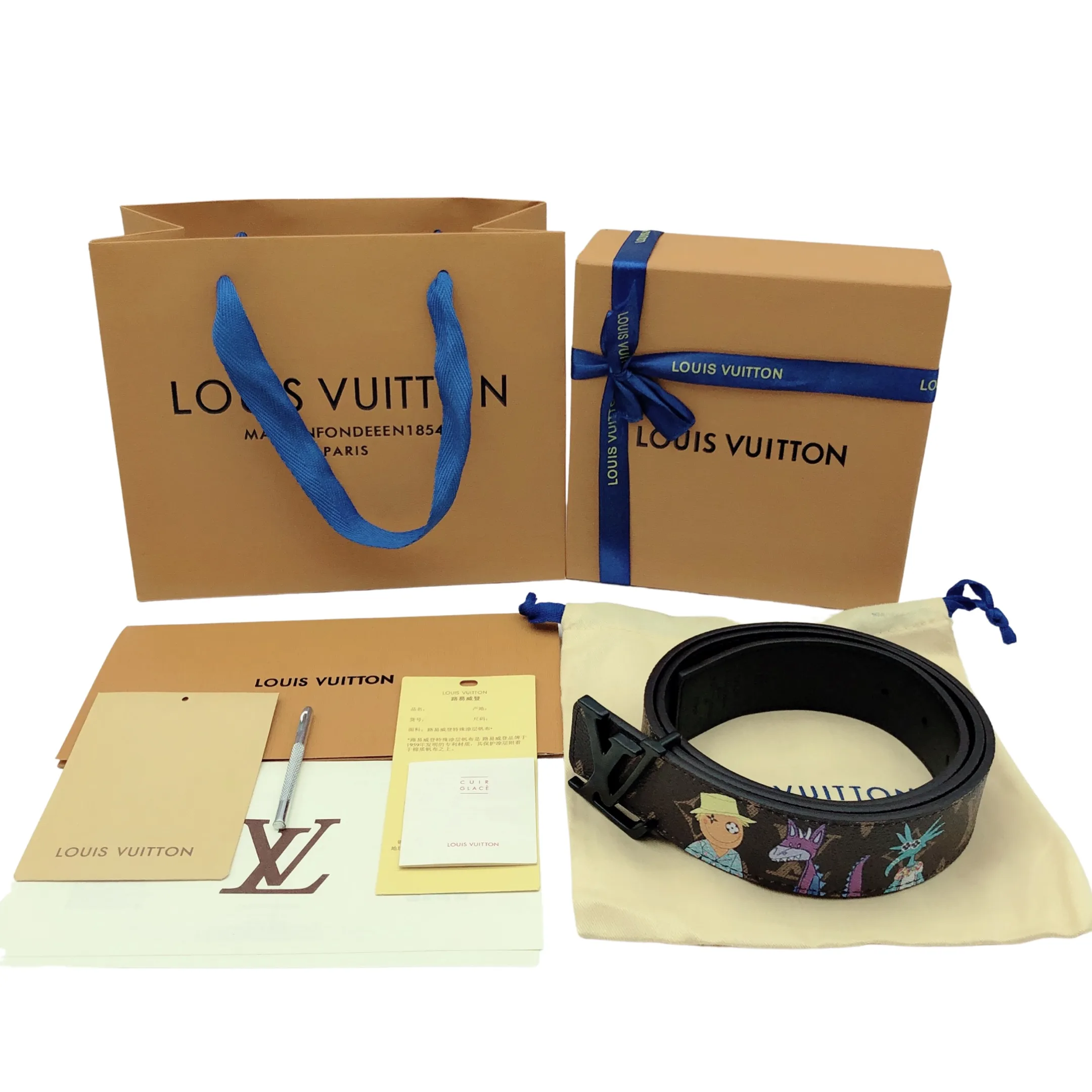 LOUIS VUITTON SHAPMM WENDEGÜRTEL – Gürtel mit Cartoon-Muster in limitierter Auflage – Braun, Breite 1/4″ (cm). Ein Must-have für alle Männer! Das klassische braune Muster ist dezent und schlicht und unterstreicht den Charme eines reifen Mannes. Das farbenfrohe Cartoon-Muster und die schwarze, gewellte Schnalle ergeben zwei unterschiedliche Stile. Dieser zeitlose Klassiker besticht durch seine dreidimensionale Optik und wirkt dennoch raffiniert und dezent, ohne zu protzig zu wirken. Ein wahrer Alleskönner.