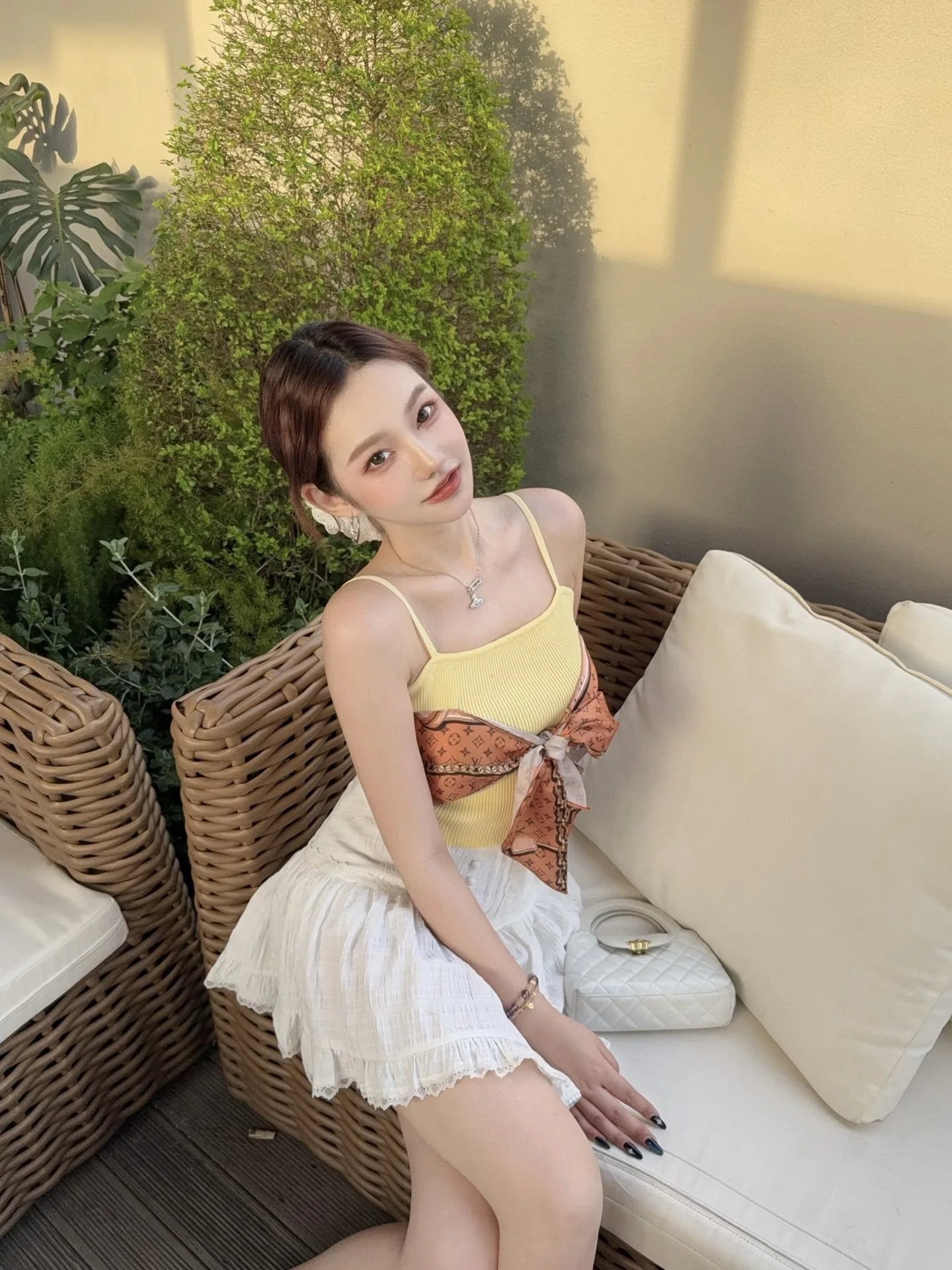 Louis Vuitton LV Seidenschal mit monochromem Kettenprint und Strickunterhemd mit Bahnenmuster