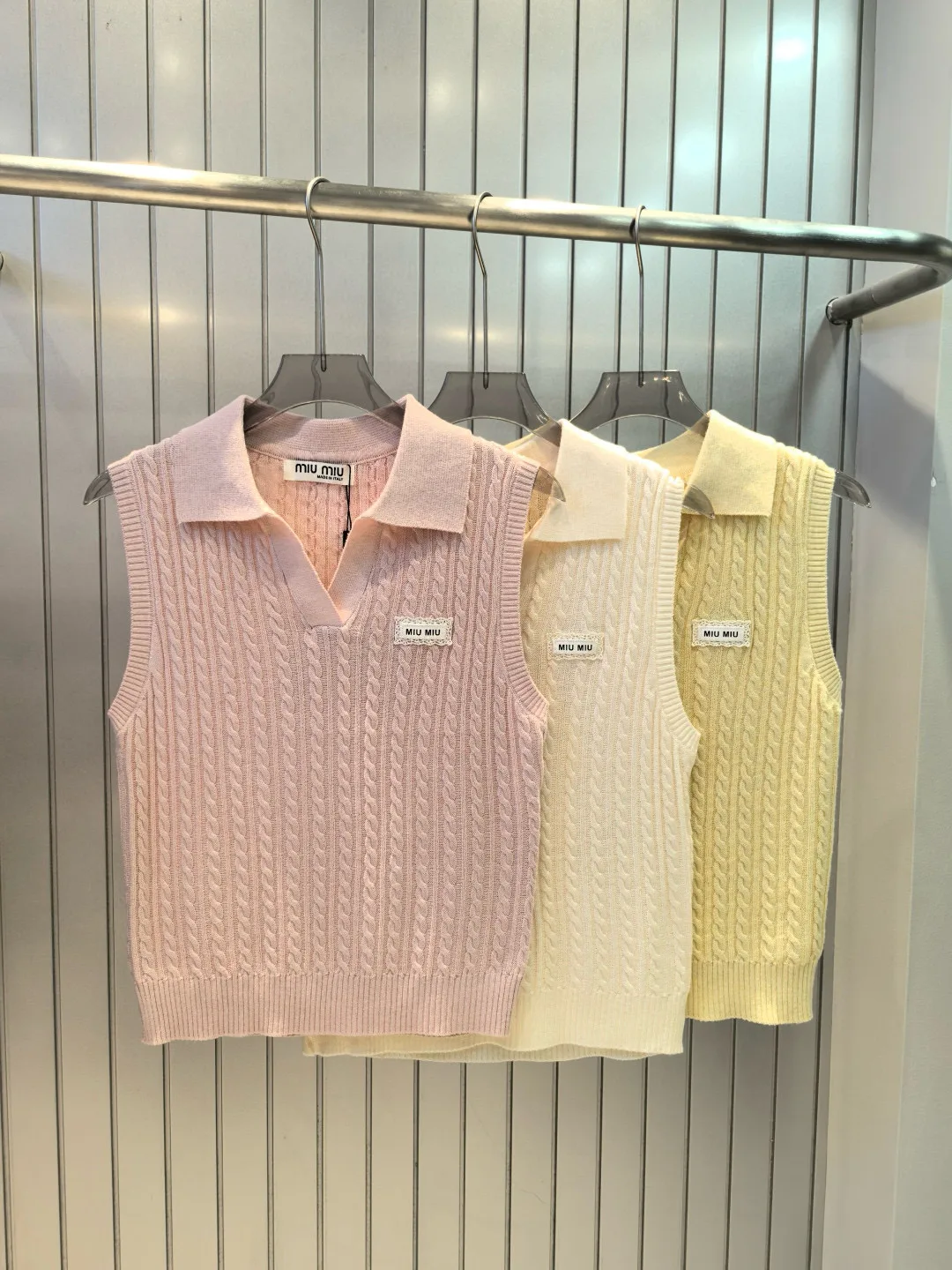 Miumiu Zopfmuster-Weste mit V-Ausschnitt und individueller Schriftzug aus Spitze und Lederetikett