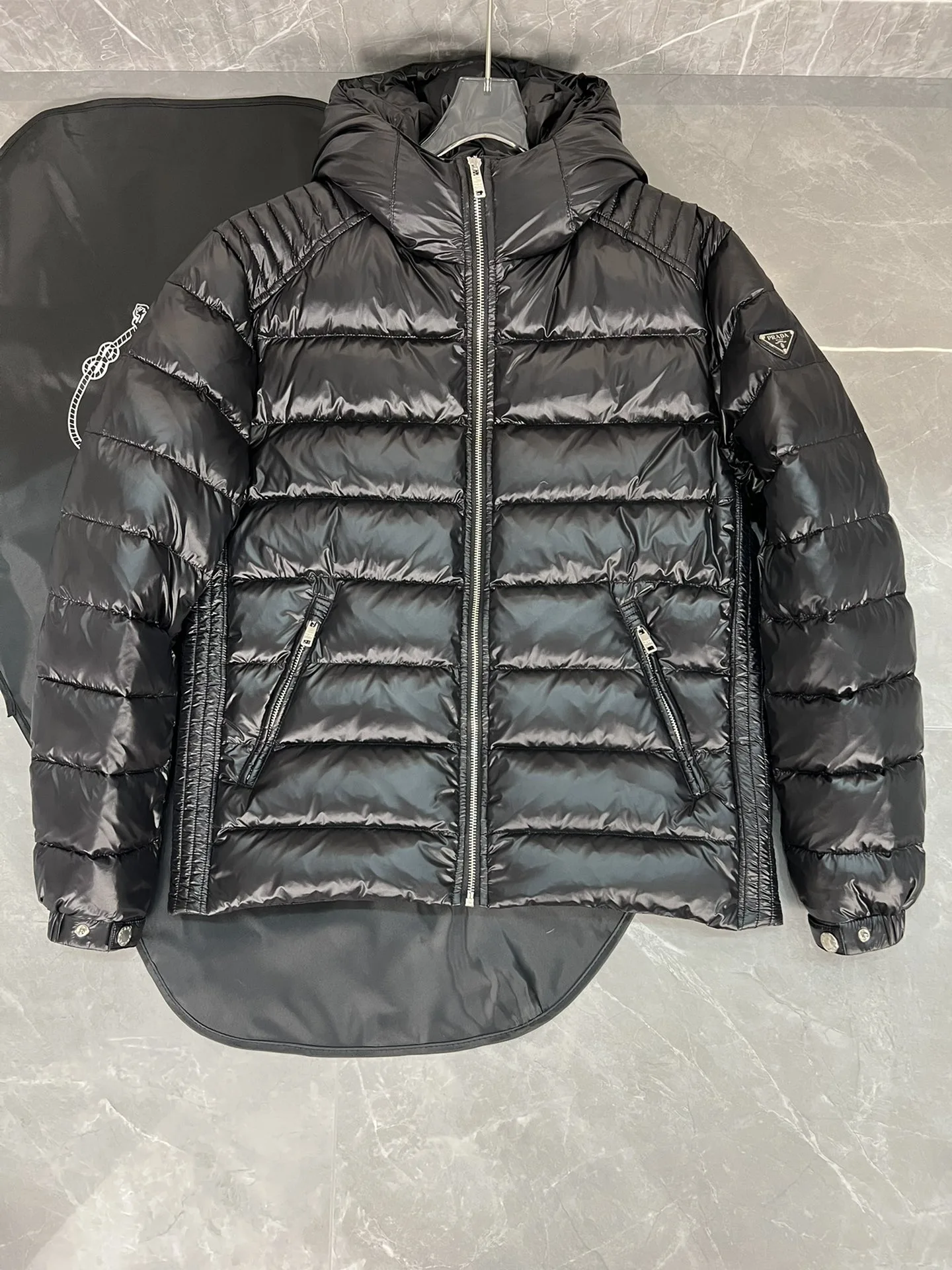 Wählen Sie die beste Version auf dem Markt aus hochwertigen Kanälen, die jede andere Version der Prada-Daunenjacke aus Stoff mit Kapuze und geprägten Schulterpolstern übertrifft. Weitere echte Fotos. Original passende Hardware. Füllung aus Entendaunen.