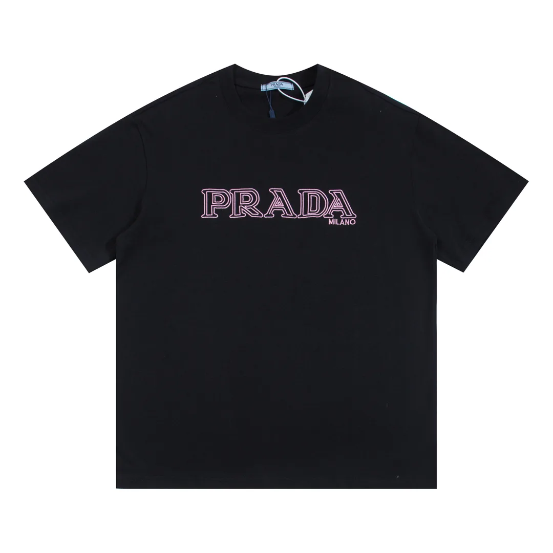 Prada Early Spring New Style. Individueller G-Doppelgarn-Baumwollstoff. Gewaschen und wasserbehandelt für Form- und Farbbeständigkeit. Importierte, hochdichte Stickerei des rosa Co-Branding-Logos. Unisex-Kurzarm-T-Shirt. Farben: Schwarz und Weiß.