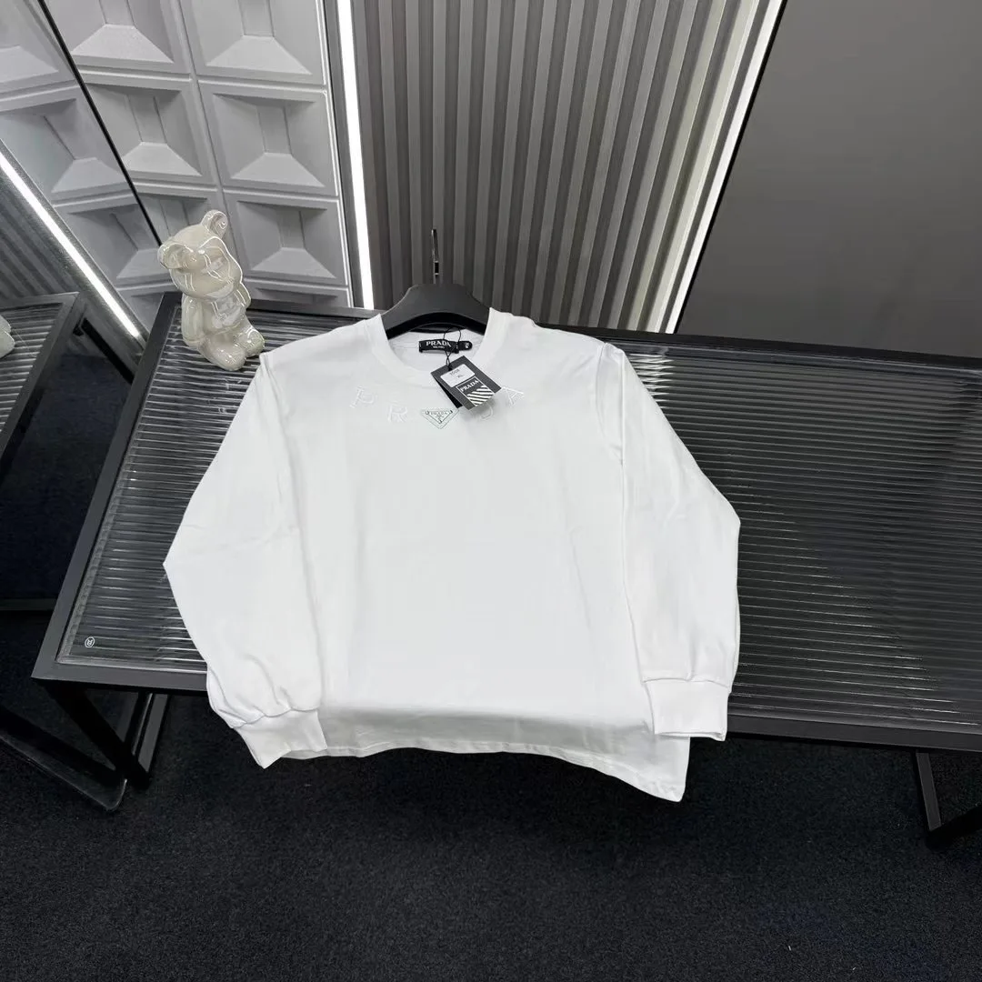 Das beflockte Prada Langarmshirt mit 3D-Schriftzug und Dreieckprägung ist ideal für den Frühherbst. Alle drei Etiketten sind identisch mit denen auf der offiziellen Website. Zoomen Sie hinein, um Details zu sehen. Foto mit der Originalkamera aufgenommen.